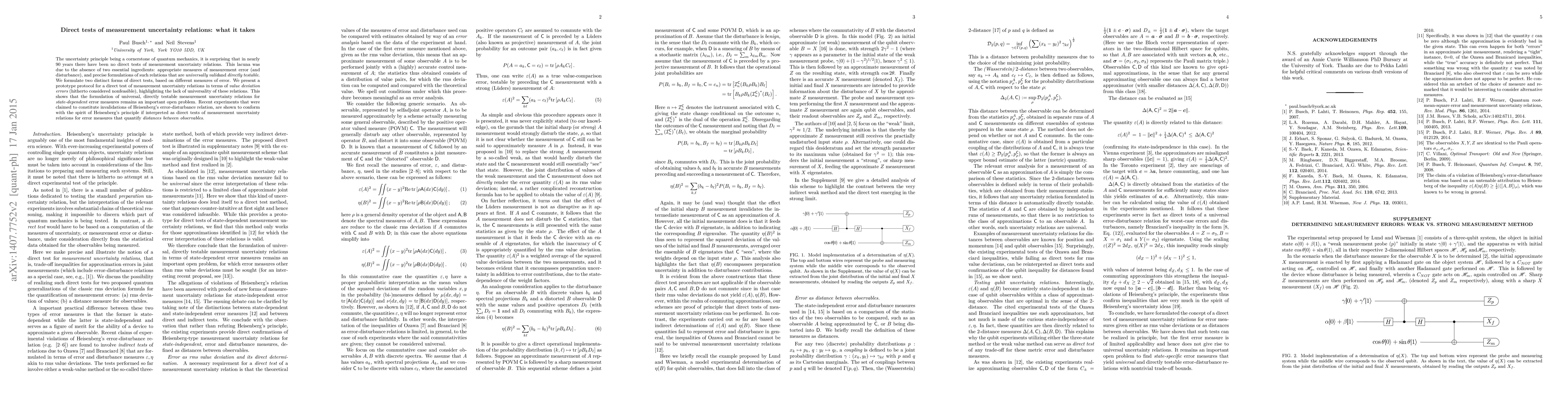The uncertainty principle being a cornerstone of quantum mechanics, it is surprising that in nearly 90 years there have been no direct tests of measurement uncertainty relations. This lacuna was due to the absence of two essential ingredients: appropriate measures of measurement error (and disturbance), and precise formulations of such relations that are {\em universally valid}and {\em directly testable}. We formulate two distinct forms of direct tests, based on different measures of error. We present a prototype protocol for a direct test of measurement uncertainty relations in terms of {\em value deviation errors} (hitherto considered nonfeasible), highlighting the lack of universality of these relations. This shows that the formulation of universal, directly testable measurement uncertainty relations for {\em state-dependent} error measures remains an important open problem. Recent experiments that were claimed to constitute invalidations of Heisenberg's error-disturbance relation are shown to conform with the spirit of Heisenberg's principle if interpreted as direct tests of measurement uncertainty relations for error measures that quantify {\em distances between observables}.