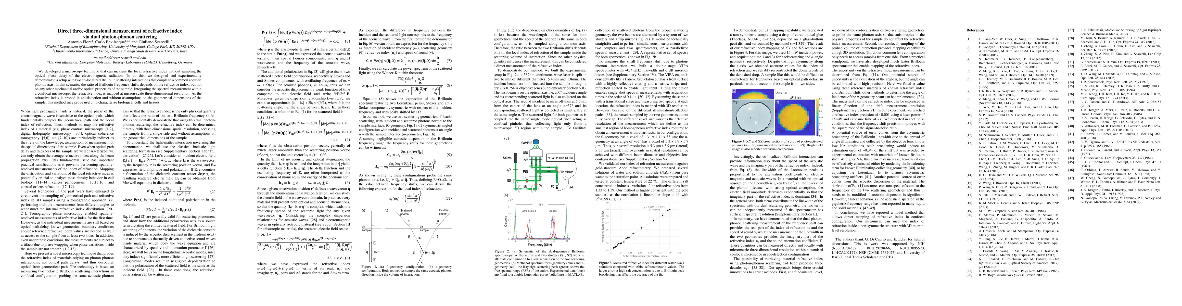 This paper introduces a novel microscopy technique for measuring the local refractive index through dual photon-phonon scattering, specifically using Brillouin scattering. The method provides 3D refractive index mapping at micron-scale resolution without relying on optical phase delay, making it applicable for characterizing biological cells and tissues.