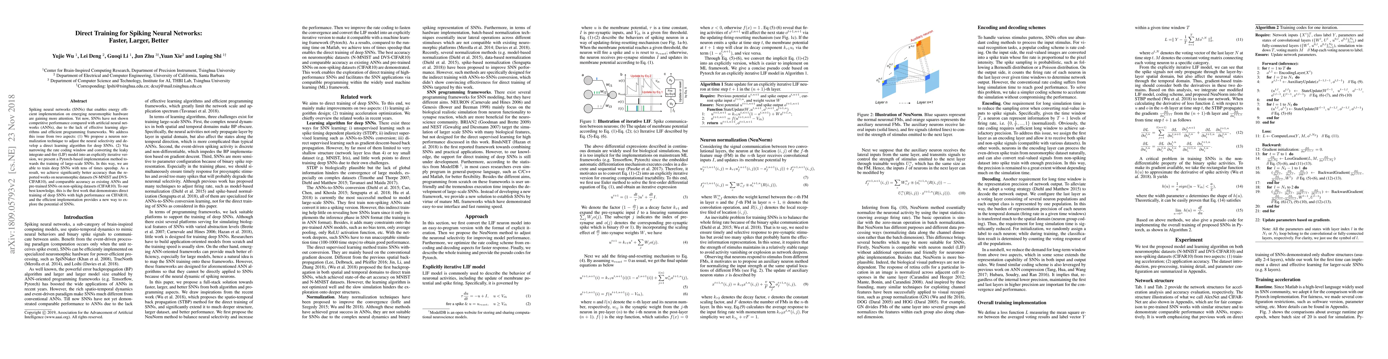 This paper proposes a neuron normalization technique and a direct learning algorithm for deep spiking neural networks (SNNs), along with a Pytorch-based implementation method for training large-scale SNNs, achieving significant speedups and competitive accuracy on neuromorphic datasets compared to artificial neural networks (ANNs).