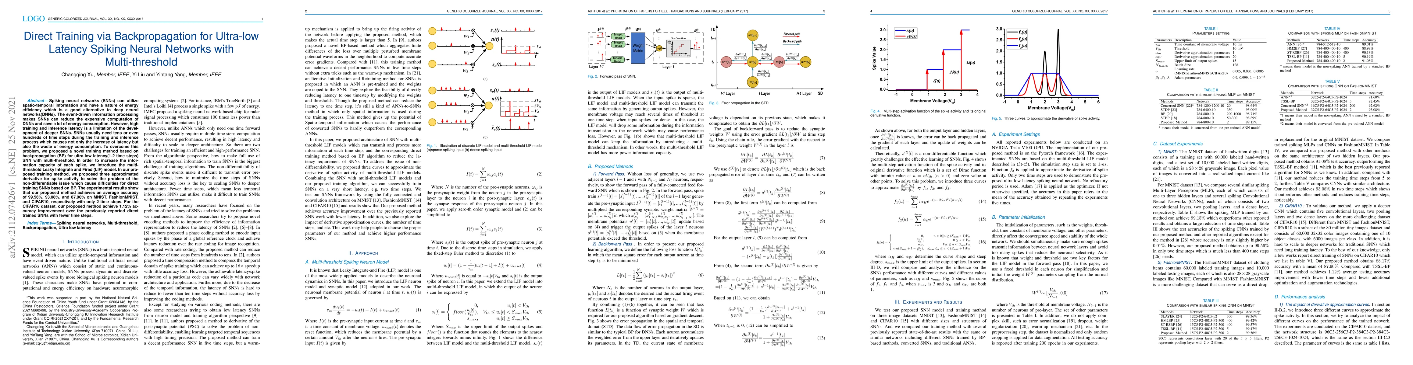 This paper proposes a novel backpropagation-based training method for ultra-low latency spiking neural networks (SNNs) with multi-threshold, achieving training and inference in just 1-2 time steps. The method introduces approximated derivatives for spike activity to address non-differentiability issues, achieving high accuracy on MNIST, FashionMNIST, and CIFAR10 datasets.