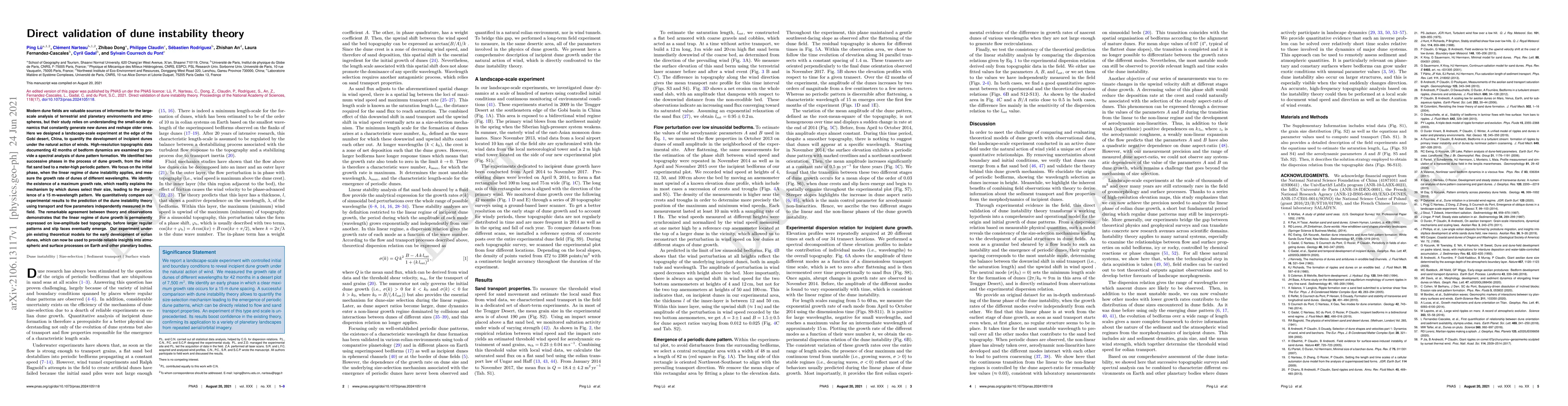 This study experimentally validates dune instability theory by analyzing high-resolution topographic data from a landscape-scale experiment in the Gobi desert, identifying a maximum growth rate that explains dune size selection. The results confirm the linear regime of dune growth, supporting existing theoretical models for early eolian dune development.