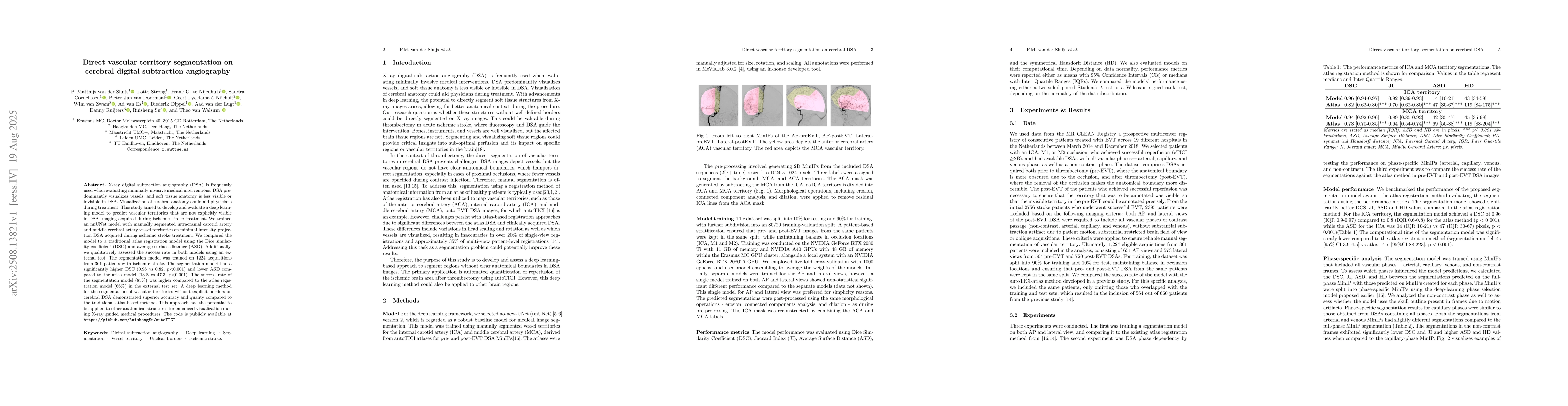 X-ray digital subtraction angiography (DSA) is frequently used when evaluating minimally invasive medical interventions. DSA predominantly visualizes vessels, and soft tissue anatomy is less visible or invisible in DSA. Visualization of cerebral anatomy could aid physicians during treatment. This study aimed to develop and evaluate a deep learning model to predict vascular territories that are not explicitly visible in DSA imaging acquired during ischemic stroke treatment. We trained an nnUNet model with manually segmented intracranial carotid artery and middle cerebral artery vessel territories on minimal intensity projection DSA acquired during ischemic stroke treatment. We compared the model to a traditional atlas registration model using the Dice similarity coefficient (DSC) and average surface distance (ASD). Additionally, we qualitatively assessed the success rate in both models using an external test. The segmentation model was trained on 1224 acquisitions from 361 patients with ischemic stroke. The segmentation model had a significantly higher DSC (0.96 vs 0.82, p<0.001) and lower ASD compared to the atlas model (13.8 vs 47.3, p<0.001). The success rate of the segmentation model (85%) was higher compared to the atlas registration model (66%) in the external test set. A deep learning method for the segmentation of vascular territories without explicit borders on cerebral DSA demonstrated superior accuracy and quality compared to the traditional atlas-based method. This approach has the potential to be applied to other anatomical structures for enhanced visualization during X-ray guided medical procedures. The code is publicly available at https://github.com/RuishengSu/autoTICI.