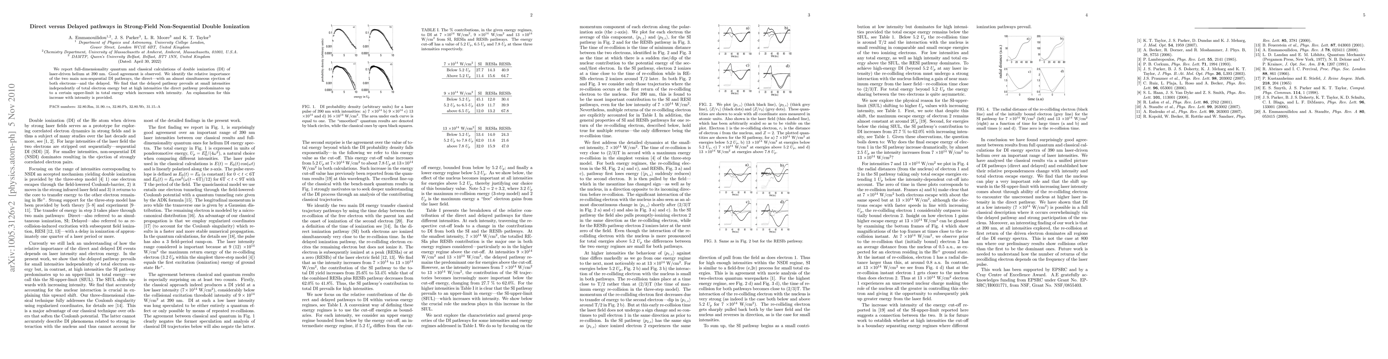This study investigates the double ionization of laser-driven helium using quantum and classical methods, revealing two distinct pathways: direct and delayed. The direct pathway, characterized by nearly simultaneous electron ejection, dominates at lower energies and higher laser intensities, while the delayed pathway prevails at higher energies regardless of intensity.