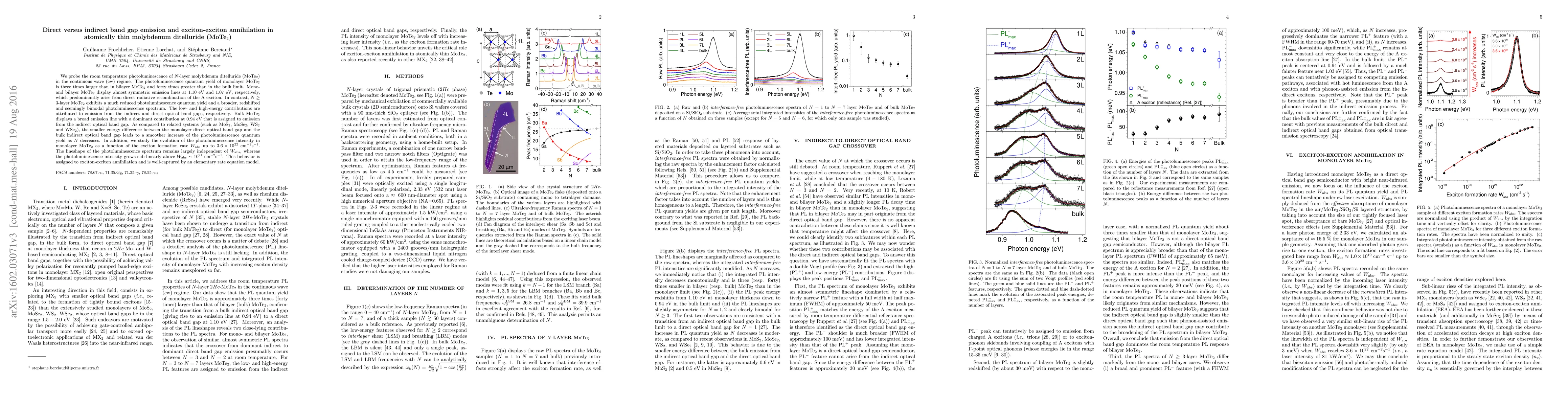 Researchers studied the photoluminescence properties of atomically thin MoTe2 crystals, finding that monolayer and bilayer samples exhibit efficient direct band gap emission, while thicker layers show reduced quantum yield and mixed indirect-direct emissions. The study suggests a relationship between crystal thickness and exciton-exciton annihilation rates.