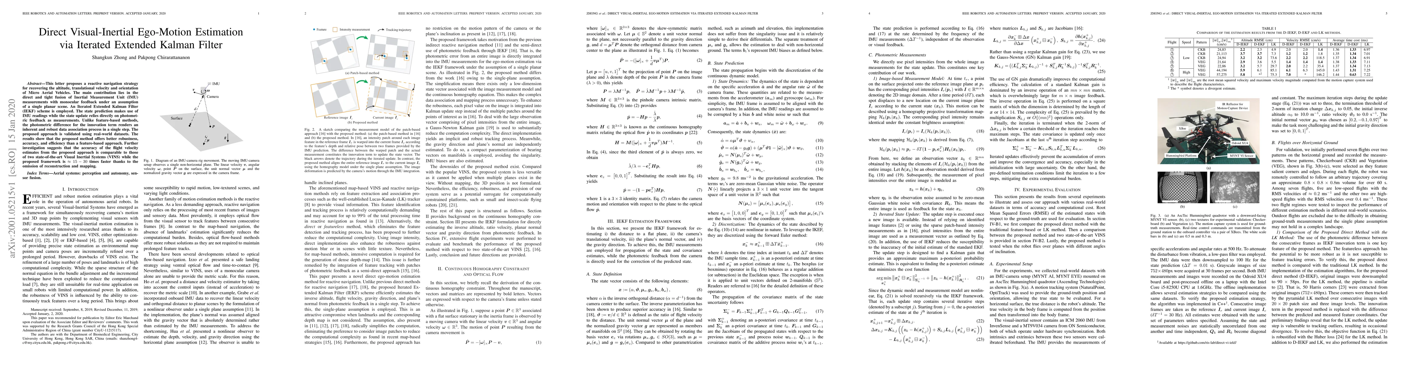 This letter proposes a reactive navigation strategy for recovering the altitude, translational velocity and orientation of Micro Aerial Vehicles. The main contribution lies in the direct and tight fusion of Inertial Measurement Unit (IMU) measurements with monocular feedback under an assumption of a single planar scene. An Iterated Extended Kalman Filter (IEKF) scheme is employed. The state prediction makes use of IMU readings while the state update relies directly on photometric feedback as measurements. Unlike feature-based methods, the photometric difference for the innovation term renders an inherent and robust data association process in a single step. The proposed approach is validated using real-world datasets. The results show that the proposed method offers better robustness, accuracy, and efficiency than a feature-based approach. Further investigation suggests that the accuracy of the flight velocity estimates from the proposed approach is comparable to those of two state-of-the-art Visual Inertial Systems (VINS) while the proposed framework is $\approx15-30$ times faster thanks to the omission of reconstruction and mapping.