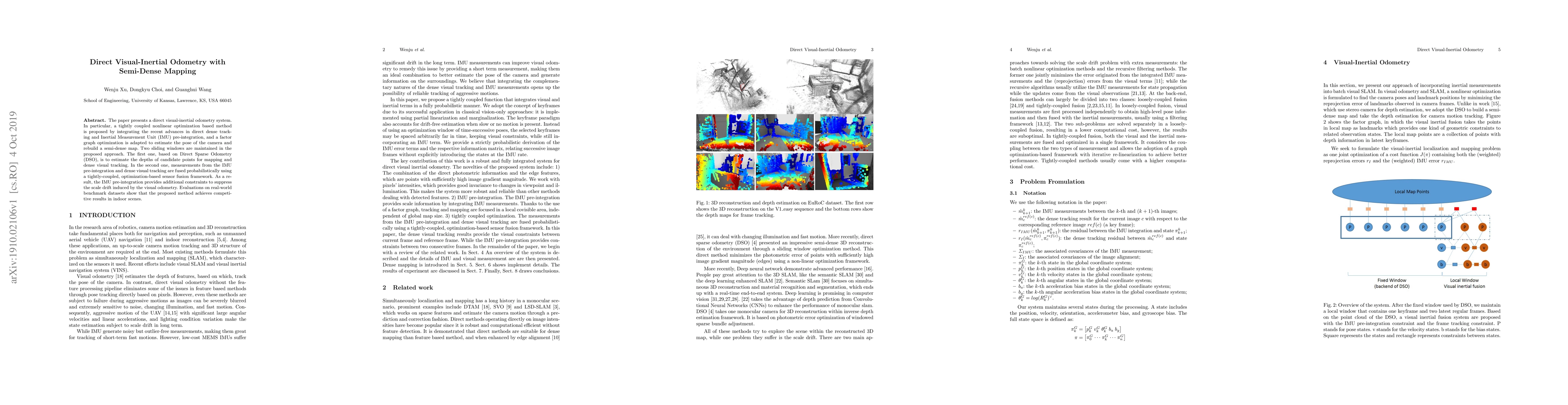 The paper proposes a direct visual-inertial odometry system using tightly-coupled nonlinear optimization, integrating direct dense tracking with IMU pre-integration. The method employs sliding windows for depth estimation and probabilistic fusion of IMU and visual data, achieving competitive results in indoor environments.