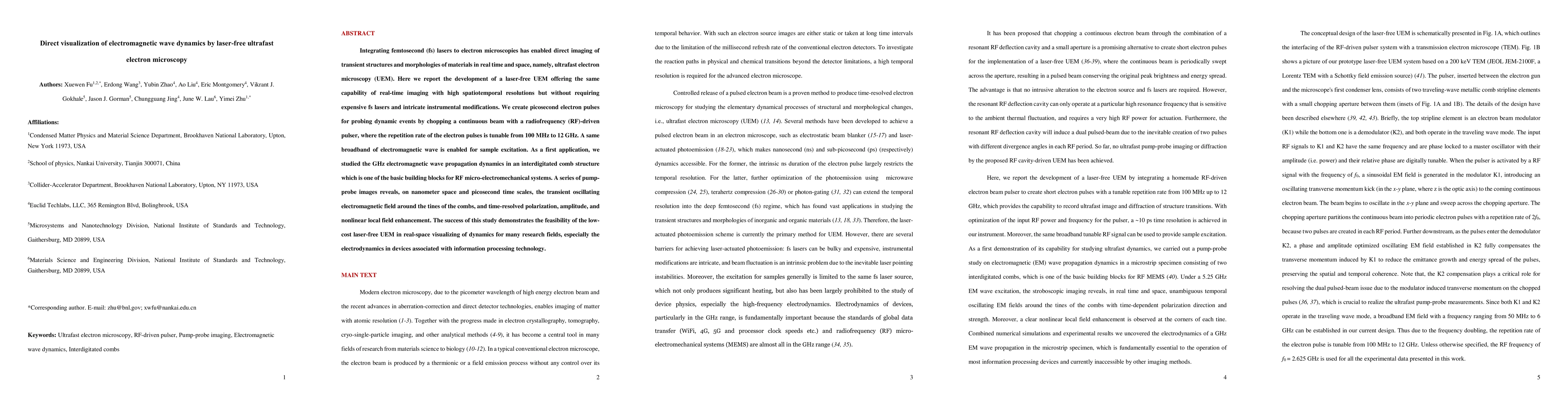 This paper introduces a laser-free ultrafast electron microscopy (UEM) that achieves real-time imaging of dynamic events without the need for femtosecond lasers. The method uses picosecond electron pulses generated by a radiofrequency-driven pulser, enabling the study of GHz electromagnetic wave propagation in RF micro-electromechanical systems.