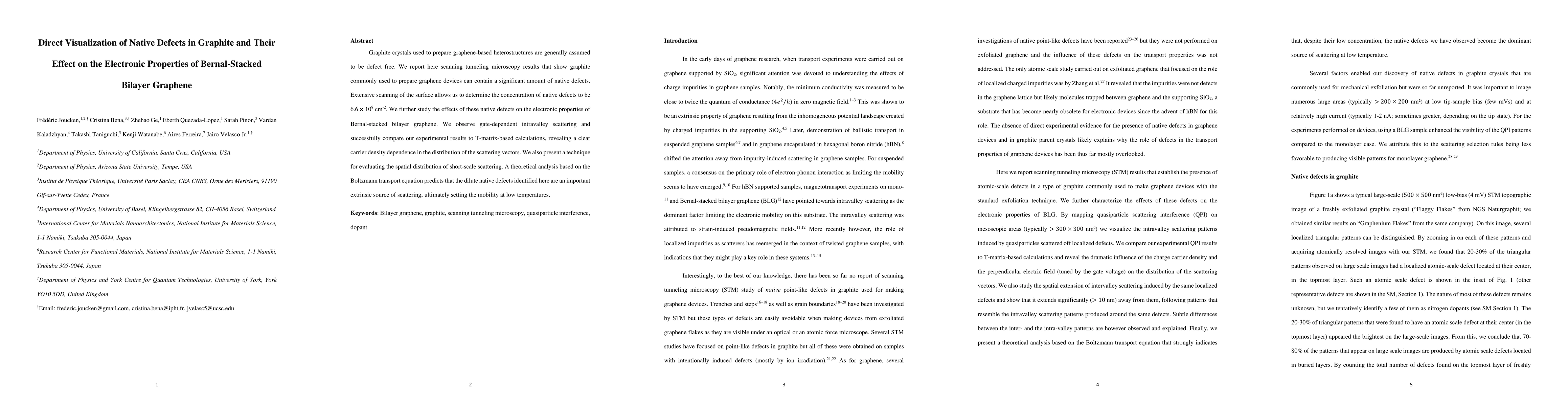 Graphite crystals used to prepare graphene-based heterostructures are generally assumed to be defect free. We report here scanning tunneling microscopy results that show graphite commonly used to prepare graphene devices can contain a significant amount of native defects. Extensive scanning of the surface allows us to determine the concentration of native defects to be 6.6$\times$10$^8$ cm$^{-2}$. We further study the effects of these native defects on the electronic properties of Bernal-stacked bilayer graphene. We observe gate-dependent intravalley scattering and successfully compare our experimental results to T-matrix-based calculations, revealing a clear carrier density dependence in the distribution of the scattering vectors. We also present a technique for evaluating the spatial distribution of short-scale scattering. A theoretical analysis based on the Boltzmann transport equation predicts that the dilute native defects identified here are an important extrinsic source of scattering, ultimately setting the mobility at low temperatures.