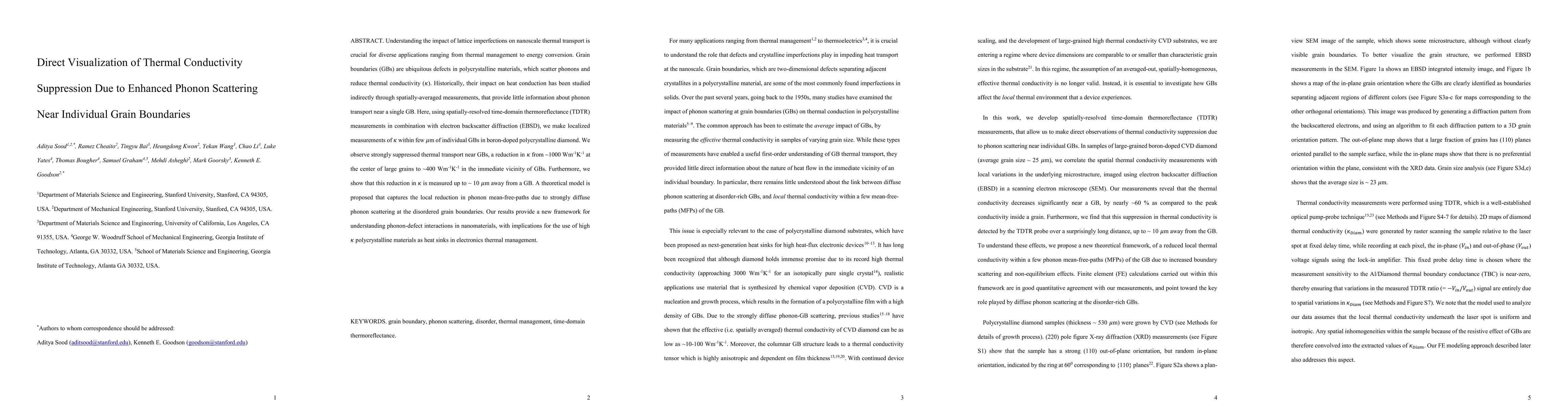 This paper presents spatially-resolved measurements showing significant suppression of thermal conductivity near individual grain boundaries in boron-doped polycrystalline diamond, using TDTR and EBSD techniques. The study reveals a reduction in thermal conductivity from ~1000 W/m-K in large grains to ~400 W/m-K near grain boundaries, with implications for phonon-defect interactions in nanomaterials.