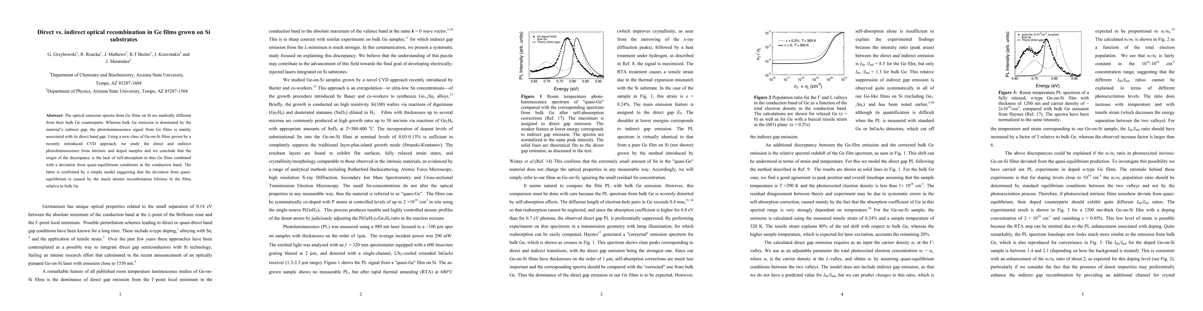 The optical emission spectra from Ge films on Si are markedly different from their bulk Ge counterparts. Whereas bulk Ge emission is dominated by the material's indirect gap, the photoluminescence signal from Ge films is mainly associated with its direct band gap. Using a new class of Ge-on-Si films grown by a recently introduced CVD approach, we study the direct and indirect photoluminescence from intrinsic and doped samples and we conclude that the origin of the discrepancy is the lack of self-absorption in thin Ge films combined with a deviation from quasi-equilibrium conditions in the conduction band. The latter is confirmed by a simple model suggesting that the deviation from quasi-equilibrium is caused by the much shorter recombination lifetime in the films relative to bulk Ge.