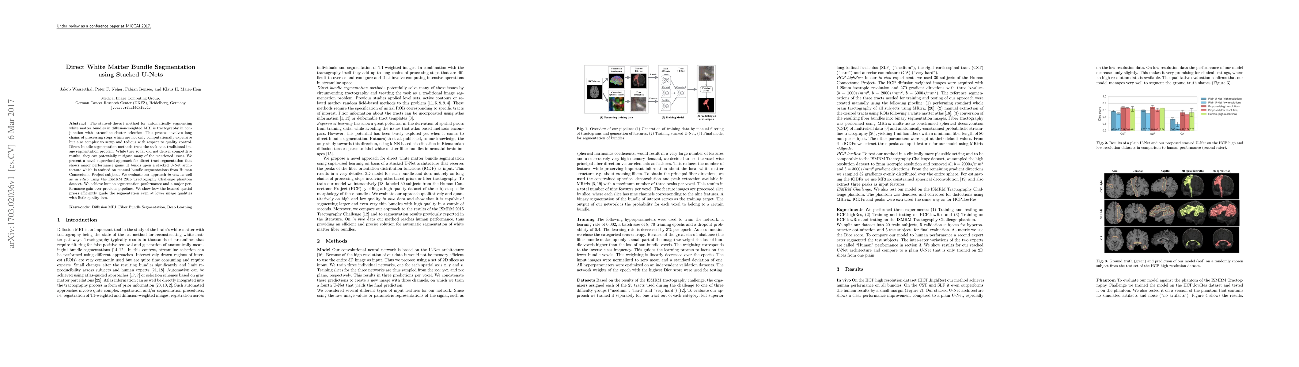 This paper introduces a novel stacked U-Net architecture for direct white matter bundle segmentation in diffusion-weighted MRI, achieving human-level performance and significant improvements over traditional tractography methods. The approach demonstrates efficiency and robustness in both \textit{in vivo} and \textit{in silico} evaluations.