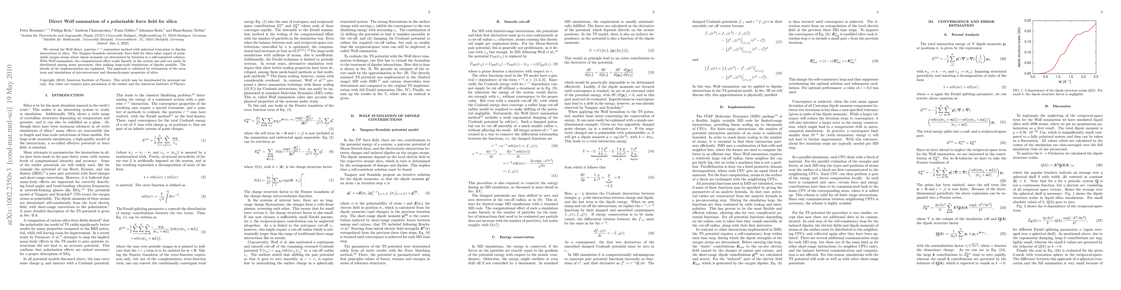 This paper extends the Wolf direct summation method to account for dipolar interactions in silica using the Tangney-Scandolo force field, enabling linear computational scaling and efficient parallel processing for large-scale simulations. The method's accuracy is validated through error term estimations and simulations of silica's microstructural and thermodynamic properties.