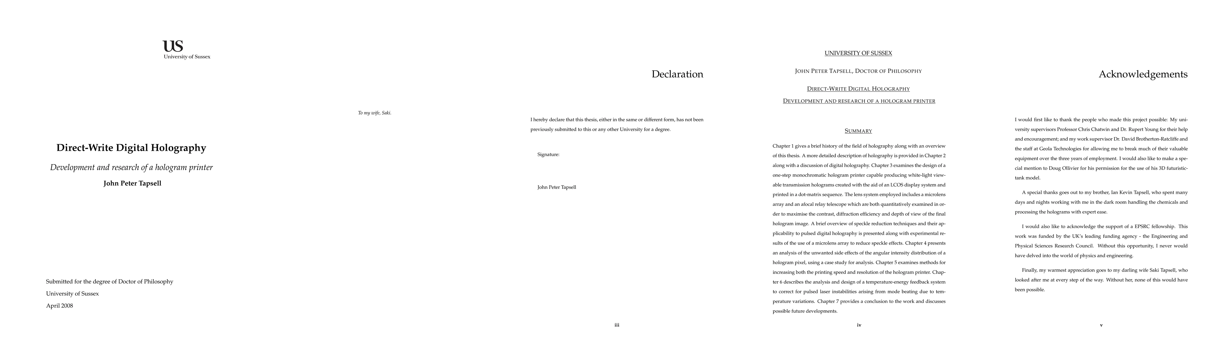 Chapter 1 gives a brief history of the field of holography along with an overview of this thesis. A more detailed description of holography is provided in Chapter 2 along with a discussion of digital holography. Chapter 3 examines the design of a one-step monochromatic hologram printer capable producing white-light viewable transmission holograms created with the aid of an LCOS display system and printed in a dot-matrix sequence. The lens system employed includes a microlens array and an afocal relay telescope which are both quantitatively examined in order to maximise the contrast, diffraction efficiency and depth of view of the final hologram image. A brief overview of speckle reduction techniques and their applicability to pulsed digital holography is presented along with experimental results of the use of a microlens array to reduce speckle effects. Chapter 4 presents an analysis of the unwanted side effects of the angular intensity distribution of a hologram pixel, using a case study for analysis. Chapter 5 examines methods for increasing both the printing speed and resolution of the hologram printer. Chapter 6 describes the analysis and design of a temperature-energy feedback system to correct for pulsed laser instabilities arising from mode beating due to temperature variations. Chapter 7 provides a conclusion to the work and discusses possible future developments.