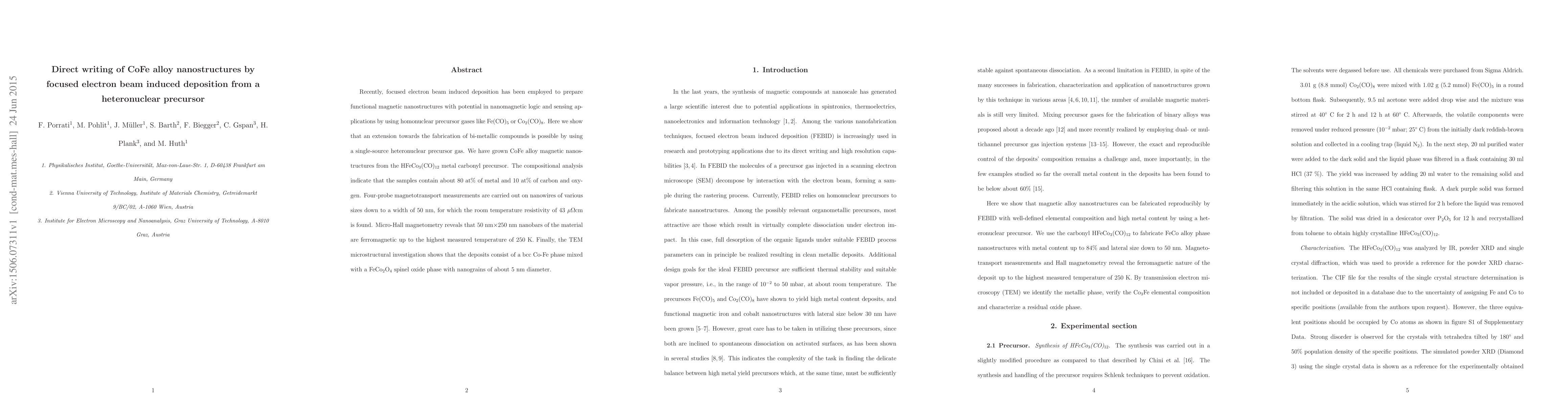 This paper demonstrates the use of focused electron beam induced deposition to fabricate CoFe alloy nanostructures from a heteronuclear precursor gas, HFeCo3(CO)12. The resulting nanostructures exhibit a ferromagnetic behavior up to 250 K, with a resistivity of 43~$\mu\Omega$cm, and consist of a bcc Co-Fe phase mixed with a FeCo2O4 spinel oxide.