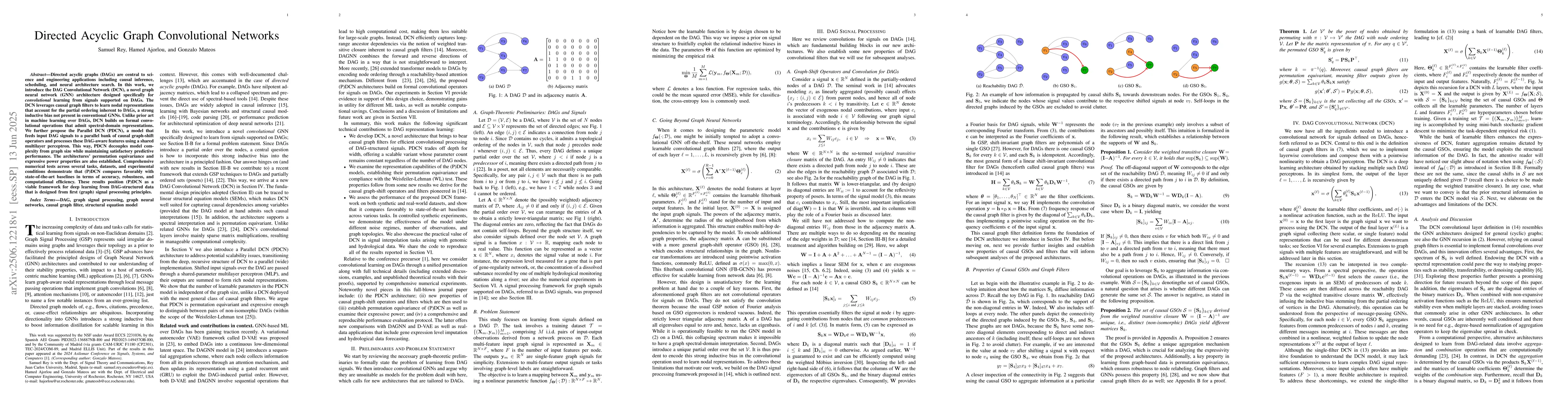 Directed acyclic graphs (DAGs) are central to science and engineering applications including causal inference, scheduling, and neural architecture search. In this work, we introduce the DAG Convolutional Network (DCN), a novel graph neural network (GNN) architecture designed specifically for convolutional learning from signals supported on DAGs. The DCN leverages causal graph filters to learn nodal representations that account for the partial ordering inherent to DAGs, a strong inductive bias does not present in conventional GNNs. Unlike prior art in machine learning over DAGs, DCN builds on formal convolutional operations that admit spectral-domain representations. We further propose the Parallel DCN (PDCN), a model that feeds input DAG signals to a parallel bank of causal graph-shift operators and processes these DAG-aware features using a shared multilayer perceptron. This way, PDCN decouples model complexity from graph size while maintaining satisfactory predictive performance. The architectures' permutation equivariance and expressive power properties are also established. Comprehensive numerical tests across several tasks, datasets, and experimental conditions demonstrate that (P)DCN compares favorably with state-of-the-art baselines in terms of accuracy, robustness, and computational efficiency. These results position (P)DCN as a viable framework for deep learning from DAG-structured data that is designed from first (graph) signal processing principles.