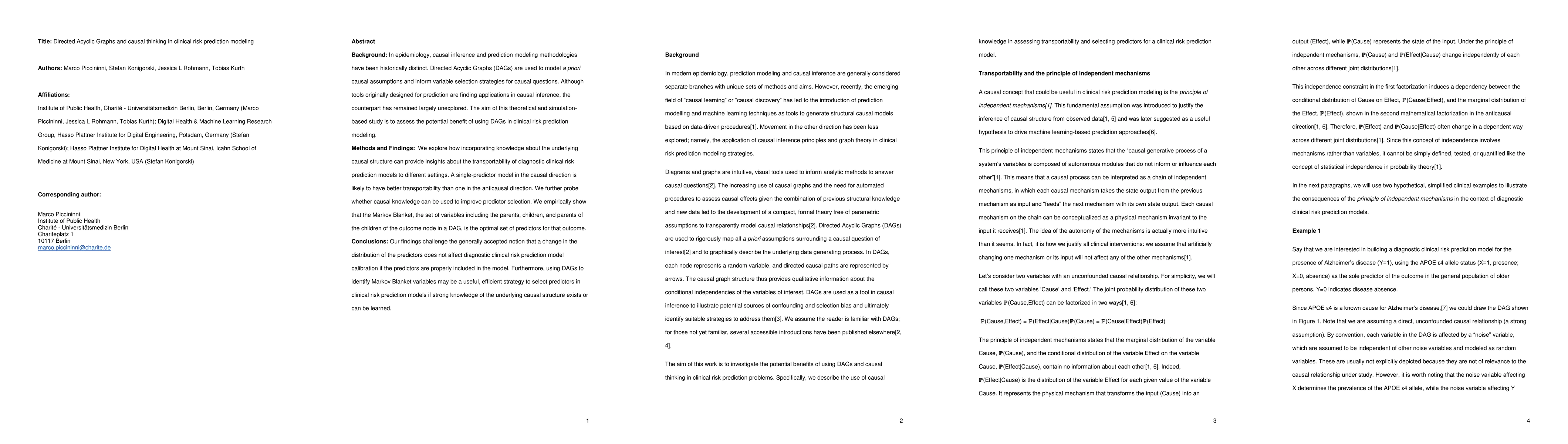 This paper explores the integration of Directed Acyclic Graphs (DAGs) in clinical risk prediction modeling to enhance causal inference and predictor selection. It finds that DAGs can improve the transportability of risk models and that the Markov Blanket derived from DAGs is optimal for predictor selection, challenging the notion that model calibration remains unaffected by changes in predictor distributions.