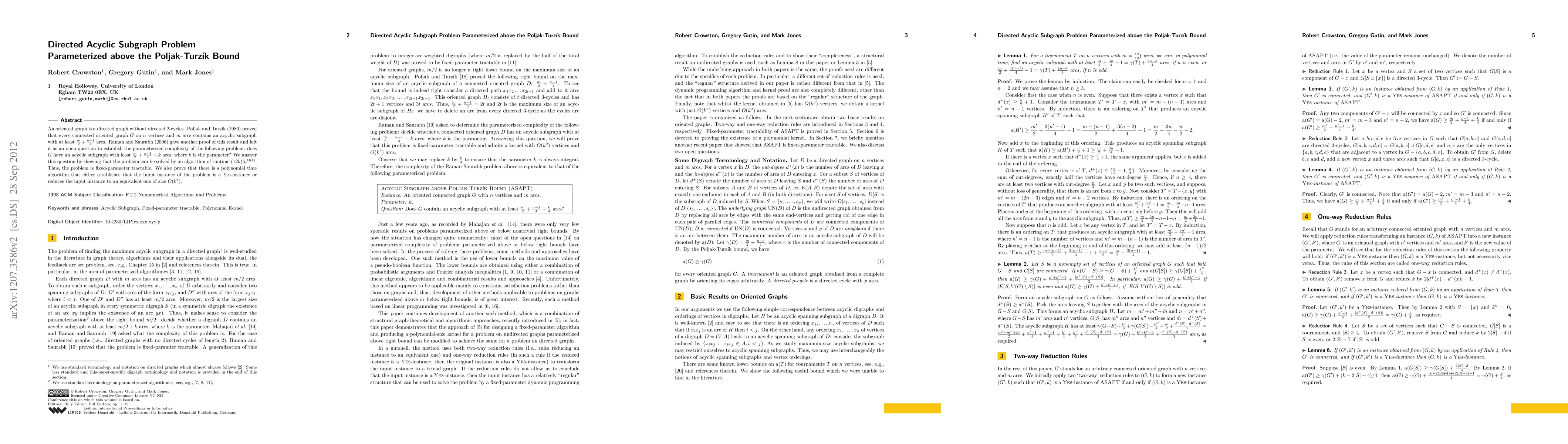 This paper addresses the Directed Acyclic Subgraph Problem parameterized above the Poljak-Turzik bound, demonstrating fixed-parameter tractability with an algorithm running in $(12k)!n^{O(1)}$ time. It also provides a polynomial time reduction algorithm that either confirms a Yes-instance or reduces the problem size to $O(k^2)$.