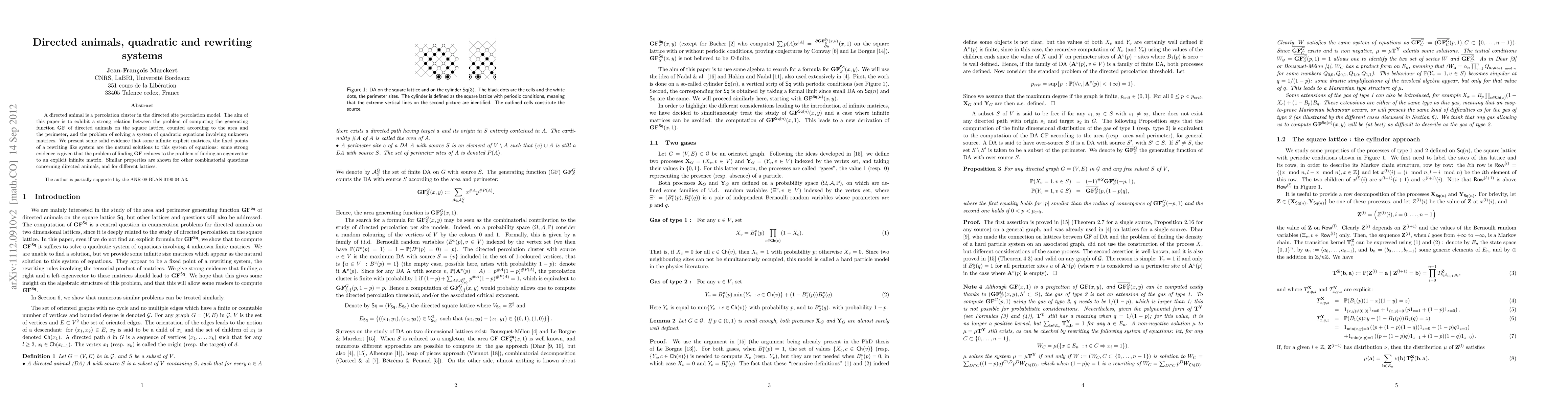 This paper establishes a connection between the generating function of directed animals in a square lattice and solving a system of quadratic matrix equations. It suggests that infinite matrices, which are fixed points of a rewriting system, may serve as solutions to these matrix equations, implying that the problem of finding the generating function reduces to finding an eigenvector of an explicit infinite matrix.