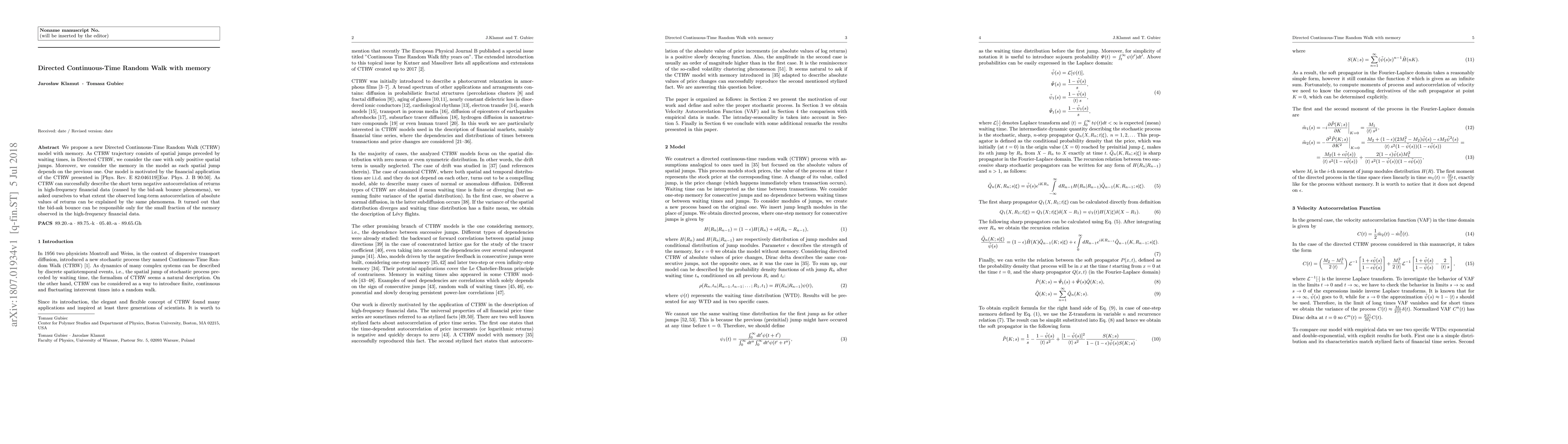 We propose a new Directed Continuous-Time Random Walk (CTRW) model with memory. As CTRW trajectory consists of spatial jumps preceded by waiting times, in Directed CTRW, we consider the case with only positive spatial jumps. Moreover, we consider the memory in the model as each spatial jump depends on the previous one. Our model is motivated by the financial application of the CTRW presented in [Phys. Rev. E 82:046119][Eur. Phys. J. B 90:50]. As CTRW can successfully describe the short term negative autocorrelation of returns in high-frequency financial data (caused by the bid-ask bounce phenomena), we asked ourselves to what extent the observed long-term autocorrelation of absolute values of returns can be explained by the same phenomena. It turned out that the bid-ask bounce can be responsible only for the small fraction of the memory observed in the high-frequency financial data.