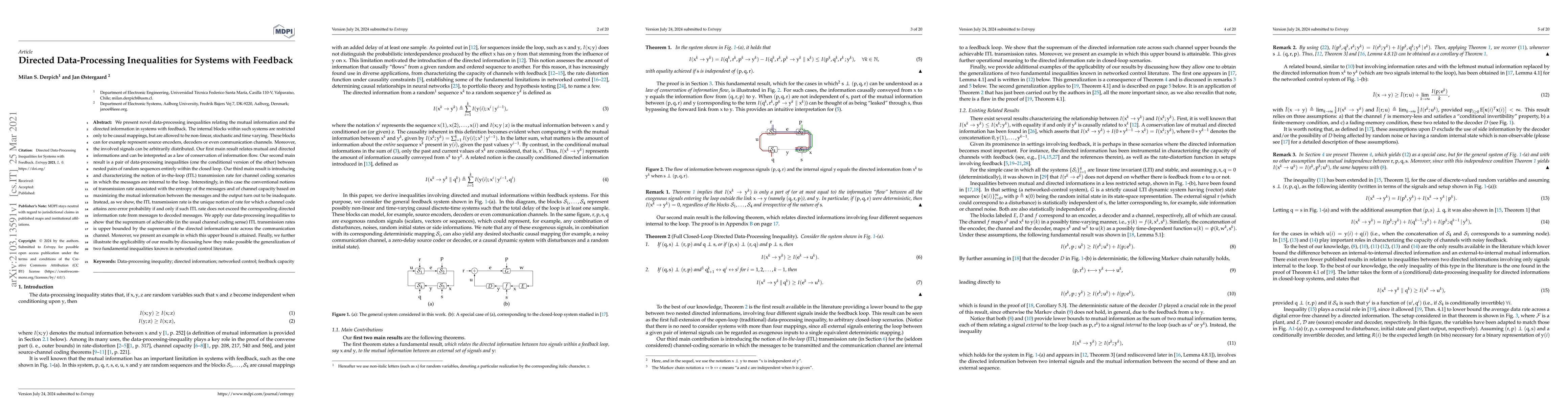 We present novel data-processing inequalities relating the mutual information and the directed information in systems with feedback. The internal blocks within such systems are restricted only to be causal mappings, but are allowed to be non-linear, stochastic and time varying. These blocks can for example represent source encoders, decoders or even communication channels. Moreover, the involved signals can be arbitrarily distributed. Our first main result relates mutual and directed informations and can be interpreted as a law of conservation of information flow. Our second main result is a pair of data-processing inequalities (one the conditional version of the other) between nested pairs of random sequences entirely within the closed loop. Our third main result is introducing and characterizing the notion of in-the-loop (ITL) transmission rate for channel coding scenarios in which the messages are internal to the loop. Interestingly, in this case the conventional notions of transmission rate associated with the entropy of the messages and of channel capacity based on maximizing the mutual information between the messages and the output turn out to be inadequate. Instead, as we show, the ITL transmission rate is the unique notion of rate for which a channel code attains zero error probability if and only if such ITL rate does not exceed the corresponding directed information rate from messages to decoded messages. We apply our data-processing inequalities to show that the supremum of achievable (in the usual channel coding sense) ITL transmission rates is upper bounded by the supremum of the directed information rate across the communication channel. Moreover, we present an example in which this upper bound is attained. Finally, ...
