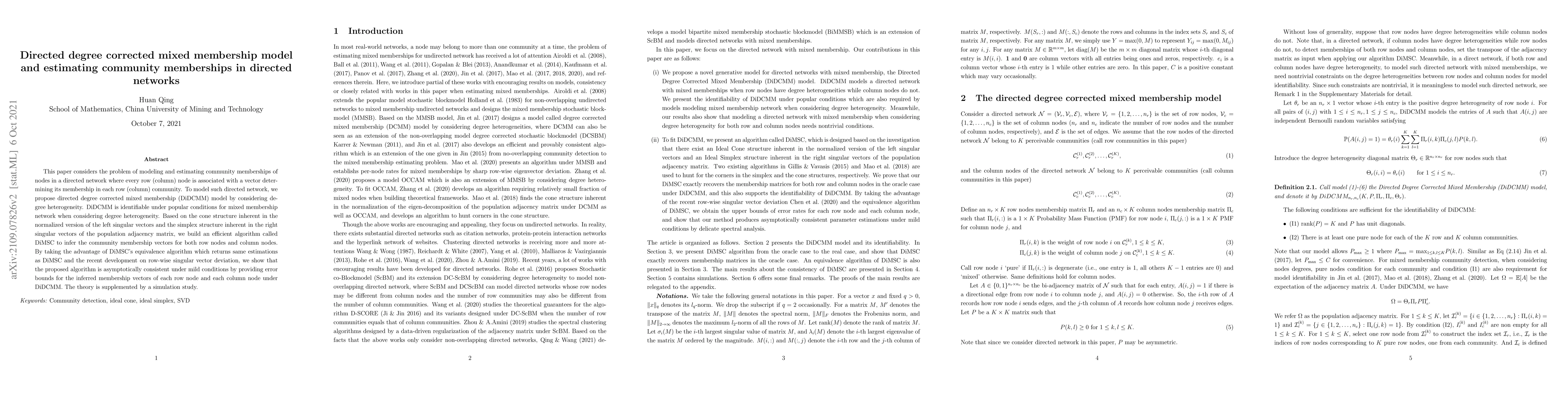 This paper proposes a directed degree corrected mixed membership (DiDCMM) model to estimate community memberships in directed networks, addressing degree heterogeneity. An efficient DiMSC algorithm is developed to infer community membership vectors, which is shown to be asymptotically consistent with error bounds, supported by a simulation study.