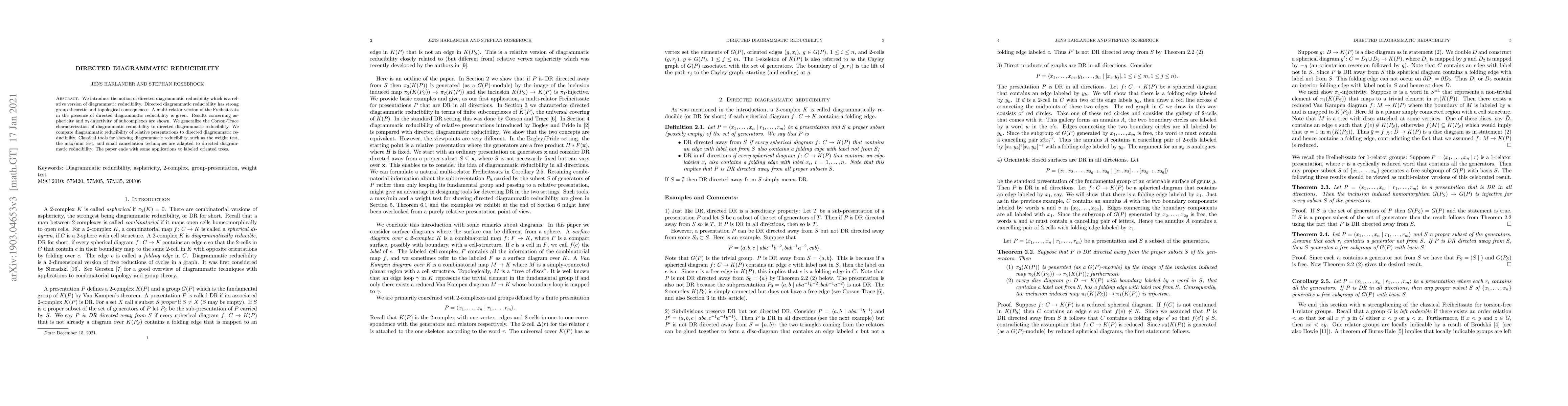 The paper's main technical contribution is the definition and study of directed diagrammatic reducibility, along with its consequences for group presentations, asphericity, and subcomplex injectivity.