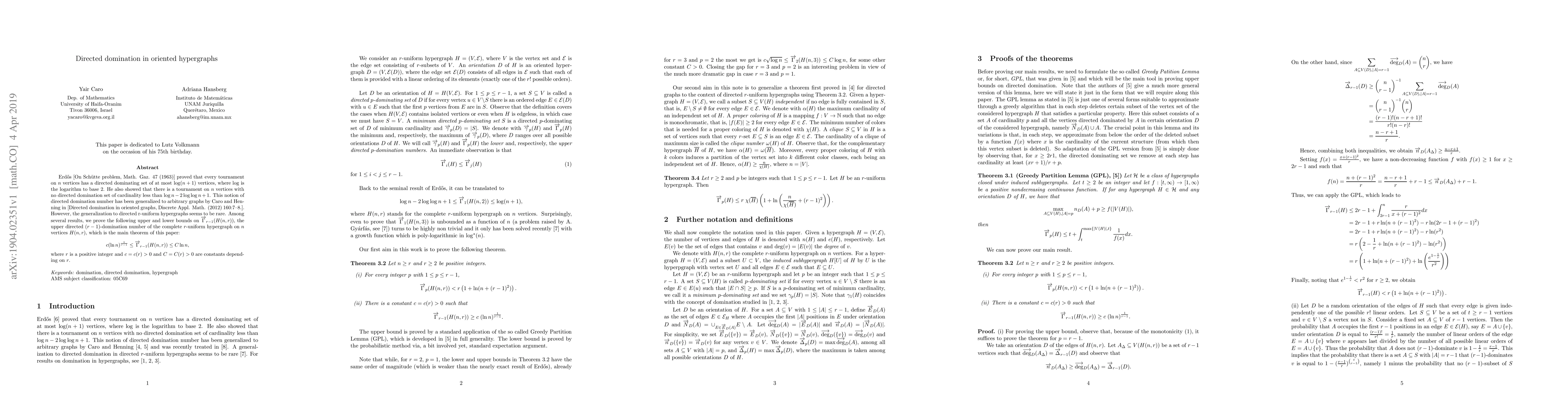 This work is novel because it uses GPL to get a general upper bound for the directed domination number of r-uniform hypergraphs