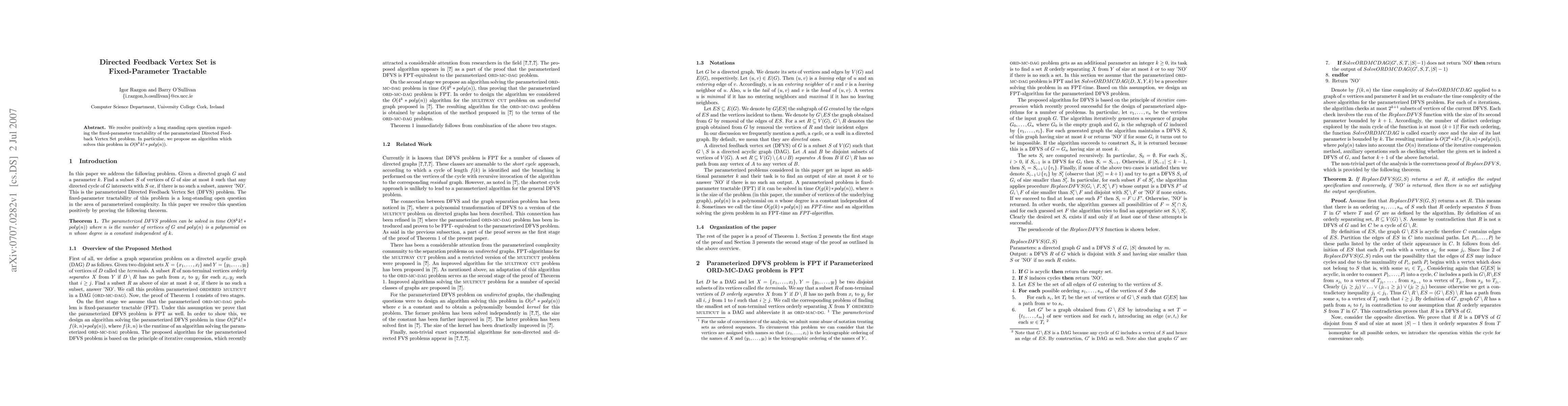 This paper confirms the fixed-parameter tractability of the Directed Feedback Vertex Set problem, presenting an algorithm that solves it in $O(8^kk!*poly(n))$ time, resolving a longstanding open question in the field.