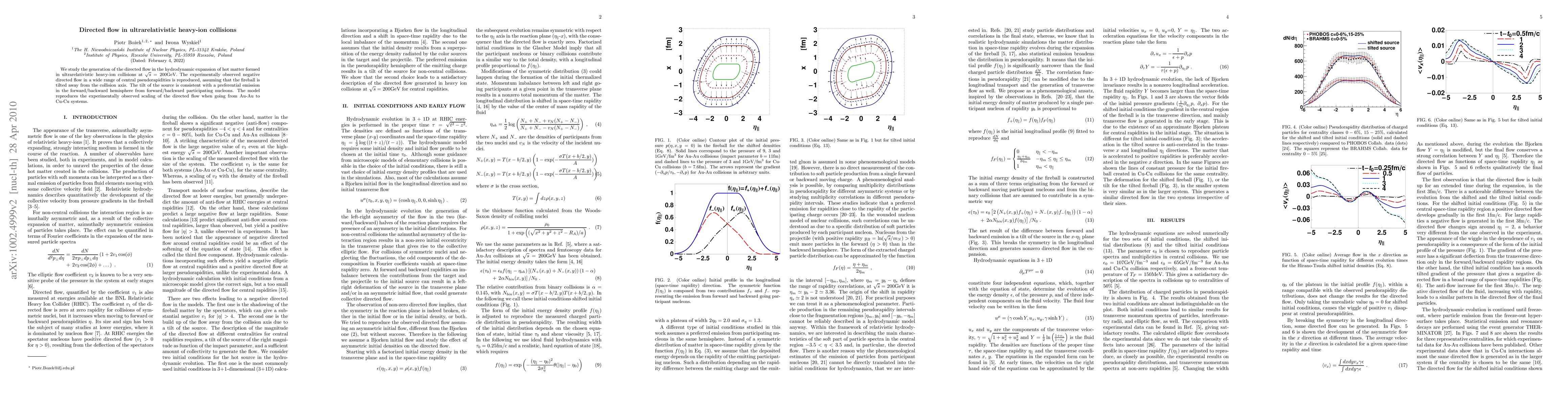 This paper investigates the directed flow in ultrarelativistic heavy-ion collisions at 200GeV, finding that a tilted fireball model can reproduce the observed negative directed flow across central pseudorapidities, consistent with emission from forward/backward nucleons. The model also accurately scales the directed flow from Au-Au to Cu-Cu systems.
