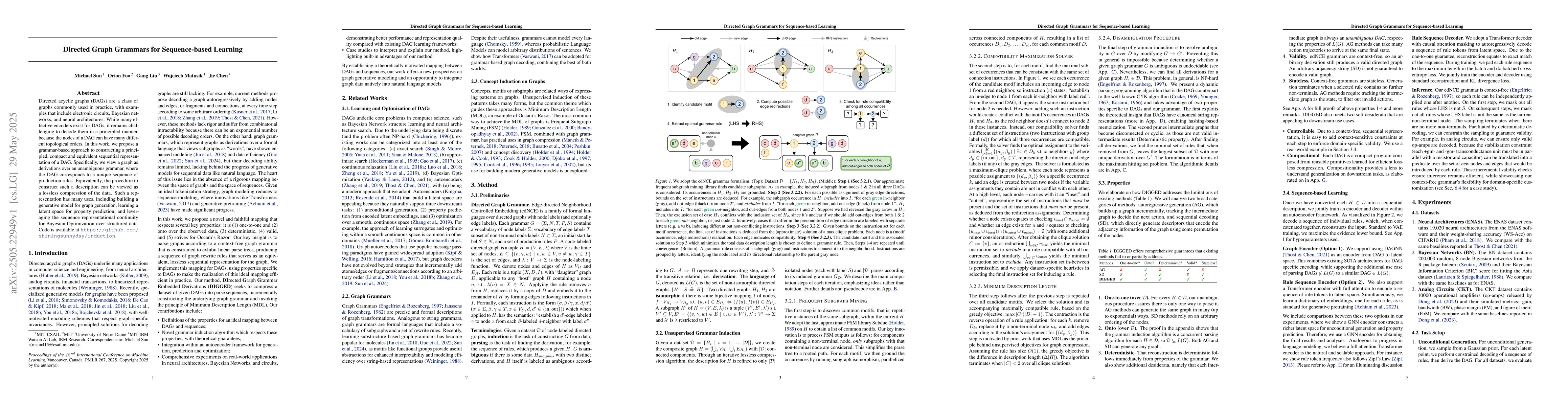 Directed acyclic graphs (DAGs) are a class of graphs commonly used in practice, with examples that include electronic circuits, Bayesian networks, and neural architectures. While many effective encoders exist for DAGs, it remains challenging to decode them in a principled manner, because the nodes of a DAG can have many different topological orders. In this work, we propose a grammar-based approach to constructing a principled, compact and equivalent sequential representation of a DAG. Specifically, we view a graph as derivations over an unambiguous grammar, where the DAG corresponds to a unique sequence of production rules. Equivalently, the procedure to construct such a description can be viewed as a lossless compression of the data. Such a representation has many uses, including building a generative model for graph generation, learning a latent space for property prediction, and leveraging the sequence representational continuity for Bayesian Optimization over structured data. Code is available at https://github.com/shiningsunnyday/induction.