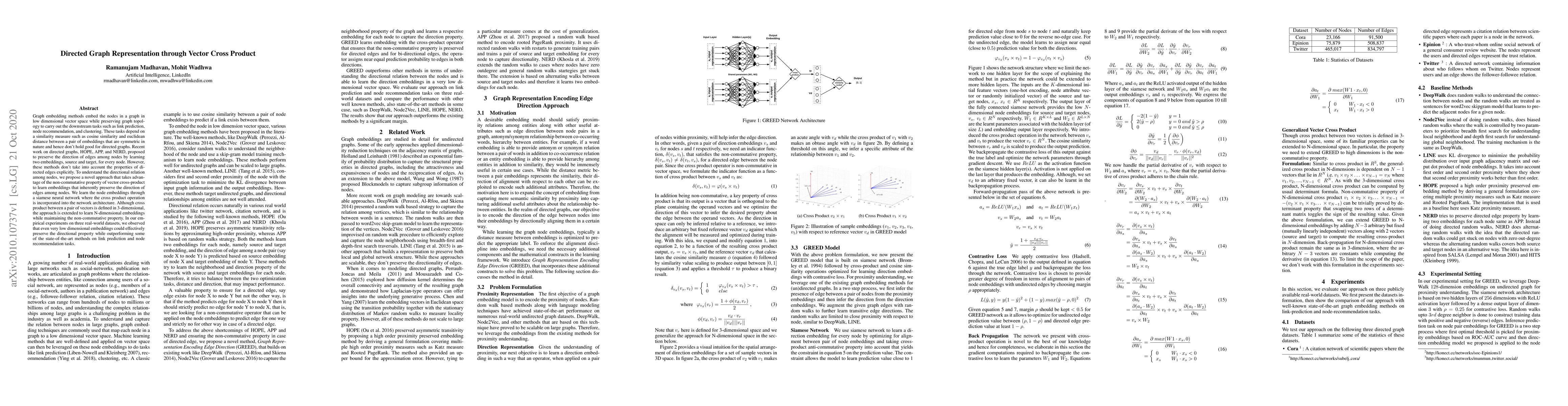 Graph embedding methods embed the nodes in a graph in low dimensional vector space while preserving graph topology to carry out the downstream tasks such as link prediction, node recommendation and clustering. These tasks depend on a similarity measure such as cosine similarity and Euclidean distance between a pair of embeddings that are symmetric in nature and hence do not hold good for directed graphs. Recent work on directed graphs, HOPE, APP, and NERD, proposed to preserve the direction of edges among nodes by learning two embeddings, source and target, for every node. However, these methods do not take into account the properties of directed edges explicitly. To understand the directional relation among nodes, we propose a novel approach that takes advantage of the non commutative property of vector cross product to learn embeddings that inherently preserve the direction of edges among nodes. We learn the node embeddings through a Siamese neural network where the cross-product operation is incorporated into the network architecture. Although cross product between a pair of vectors is defined in three dimensional, the approach is extended to learn N dimensional embeddings while maintaining the non-commutative property. In our empirical experiments on three real-world datasets, we observed that even very low dimensional embeddings could effectively preserve the directional property while outperforming some of the state-of-the-art methods on link prediction and node recommendation tasks