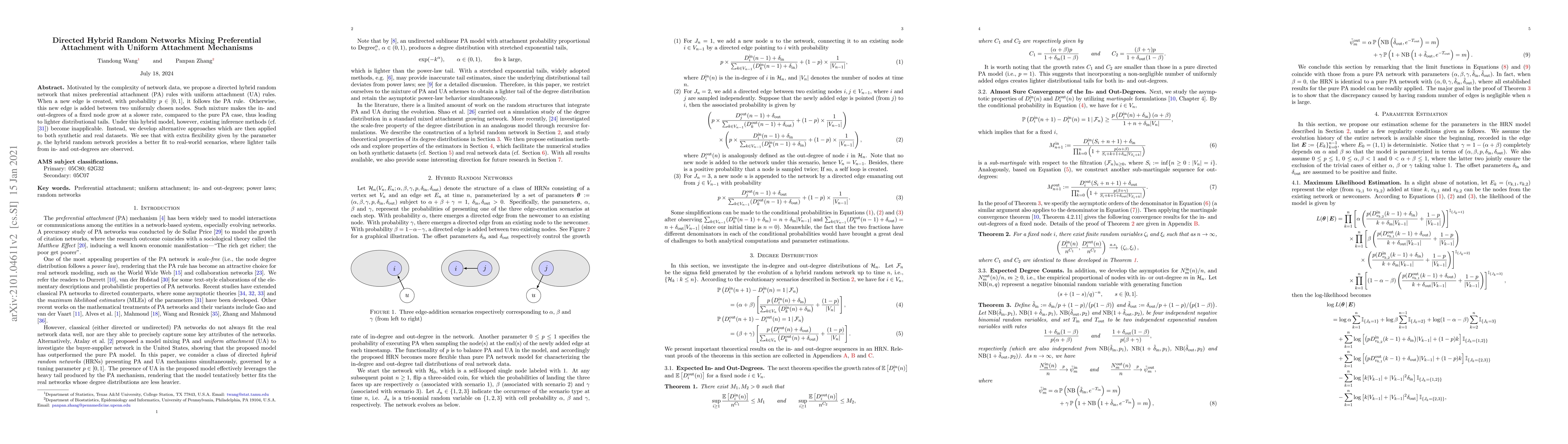 Motivated by the complexity of network data, we propose a directed hybrid random network that mixes preferential attachment (PA) rules with uniform attachment (UA) rules. When a new edge is created, with probability $p\in [0,1]$, it follows the PA rule. Otherwise, this new edge is added between two uniformly chosen nodes. Such mixture makes the in- and out-degrees of a fixed node grow at a slower rate, compared to the pure PA case, thus leading to lighter distributional tails. Useful inference methods for the proposed hybrid model are then provided and applied to both synthetic and real datasets. We see that with extra flexibility given by the parameter $p$, the hybrid random network provides a better fit to real-world scenarios, where lighter tails from in- and out-degrees are observed.