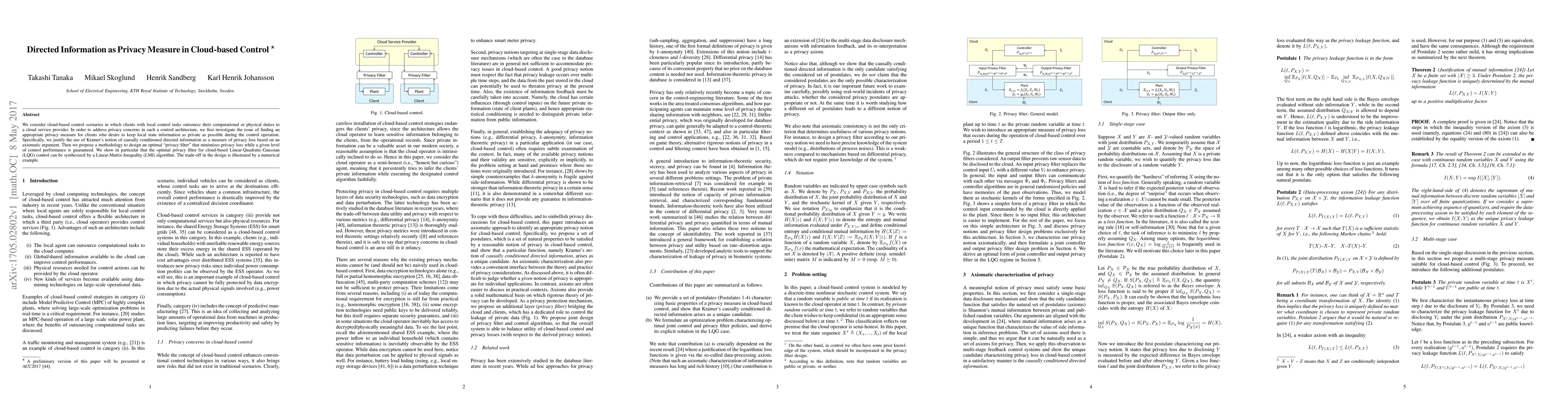 This paper investigates privacy measures in cloud-based control systems, proposing directed information as a privacy loss metric and developing an optimal "privacy filter" using Linear-Matrix-Inequality algorithms to minimize privacy loss while maintaining control performance. A numerical example demonstrates the trade-off in the design.