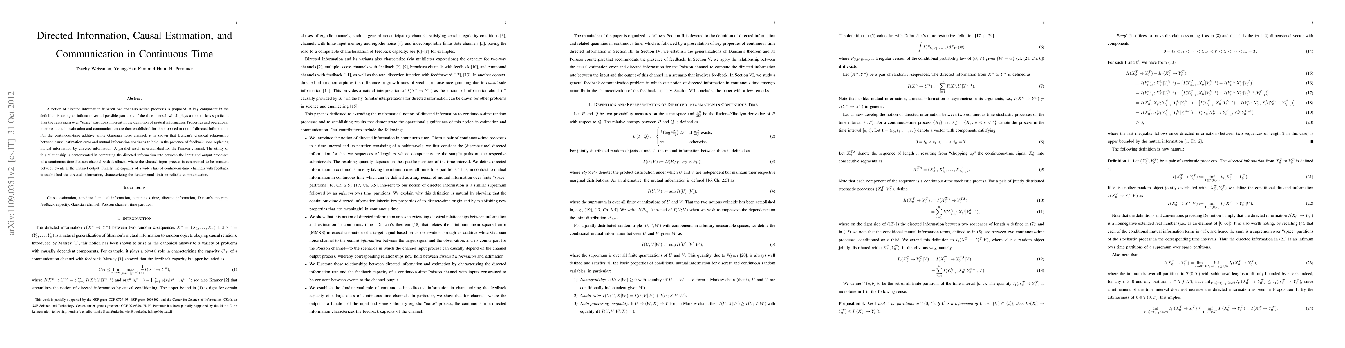 This paper proposes a concept of directed information for continuous-time processes, establishing its properties and applications in causal estimation and communication. It demonstrates the utility of this concept in computing directed information rates and establishing the capacity of continuous-time channels with feedback.