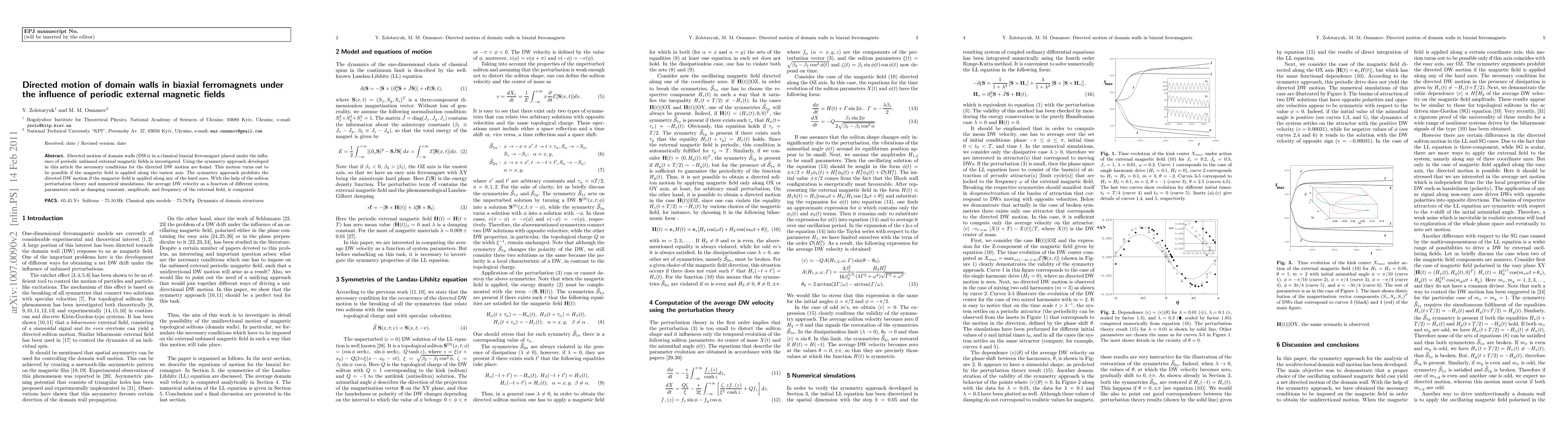 This paper investigates the directed motion of domain walls in biaxial ferromagnets under periodic external magnetic fields, finding that directed motion occurs only when the field is applied along the easy axis. The study uses symmetry and soliton perturbation theory to compute the average domain wall velocity based on system parameters.