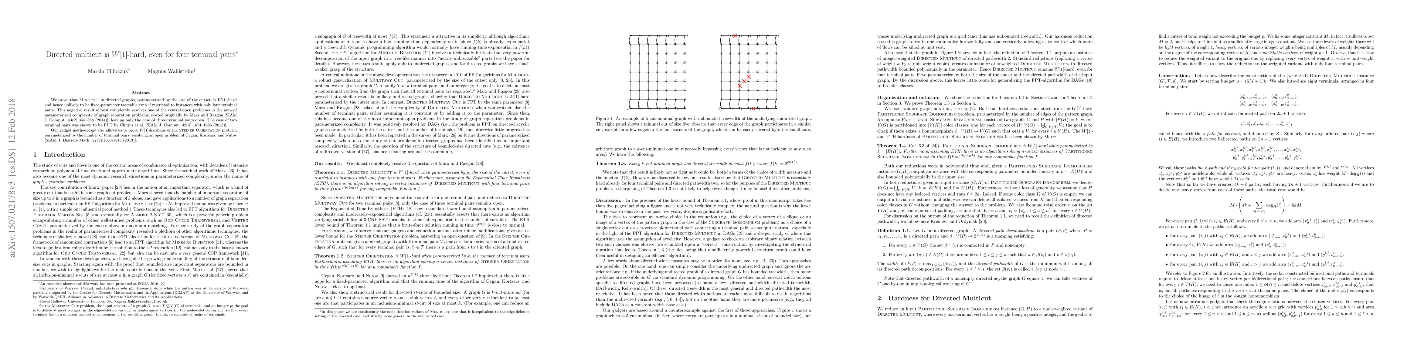 This paper proves that the directed multicut problem in directed graphs remains W[1]-hard for instances with only four terminal pairs, confirming it is unlikely to be fixed-parameter tractable. It also resolves the Steiner Orientation problem's W[1]-hardness, closing significant open questions in parameterized complexity of graph separation problems.