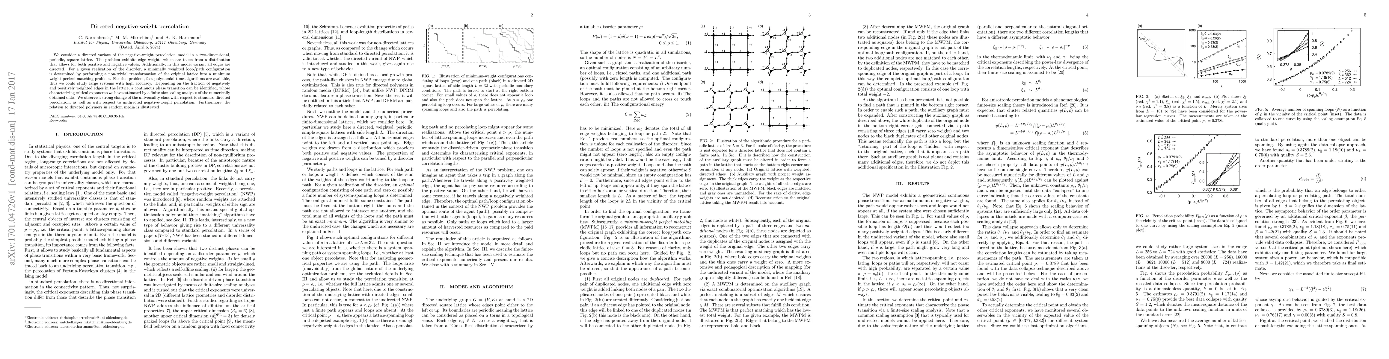 This paper investigates a directed variant of negative-weight percolation on a two-dimensional square lattice, where edges have directed, positive or negative weights. It identifies a continuous phase transition and estimates critical exponents, noting a distinct universality class compared to standard directed and undirected percolation, and links the model to directed polymers in random environments.