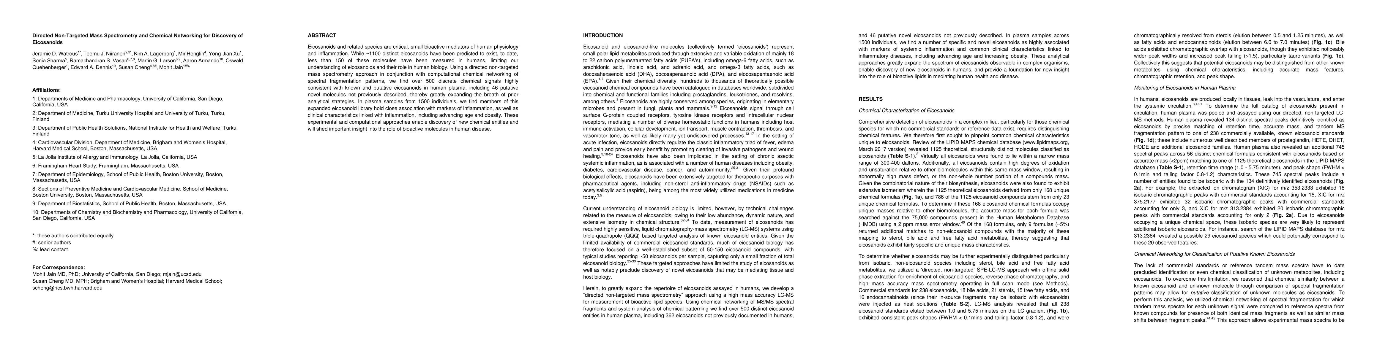 Eicosanoids and related species are critical, small bioactive mediators of human physiology and inflammation. While ~1100 distinct eicosanoids have been predicted to exist, to date, less than 150 of these molecules have been measured in humans, limiting our understanding of eicosanoids and their role in human biology. Using a directed non-targeted mass spectrometry approach in conjunction with computational chemical networking of spectral fragmentation patterns, we find over 500 discrete chemical signals highly consistent with known and putative eicosanoids in human plasma, including 46 putative novel molecules not previously described, thereby greatly expanding the breath of prior analytical strategies. In plasma samples from 1500 individuals, we find members of this expanded eicosanoid library hold close association with markers of inflammation, as well as clinical characteristics linked with inflammation, including advancing age and obesity. These experimental and computational approaches enable discovery of new chemical entities and will shed important insight into the role of bioactive molecules in human disease.