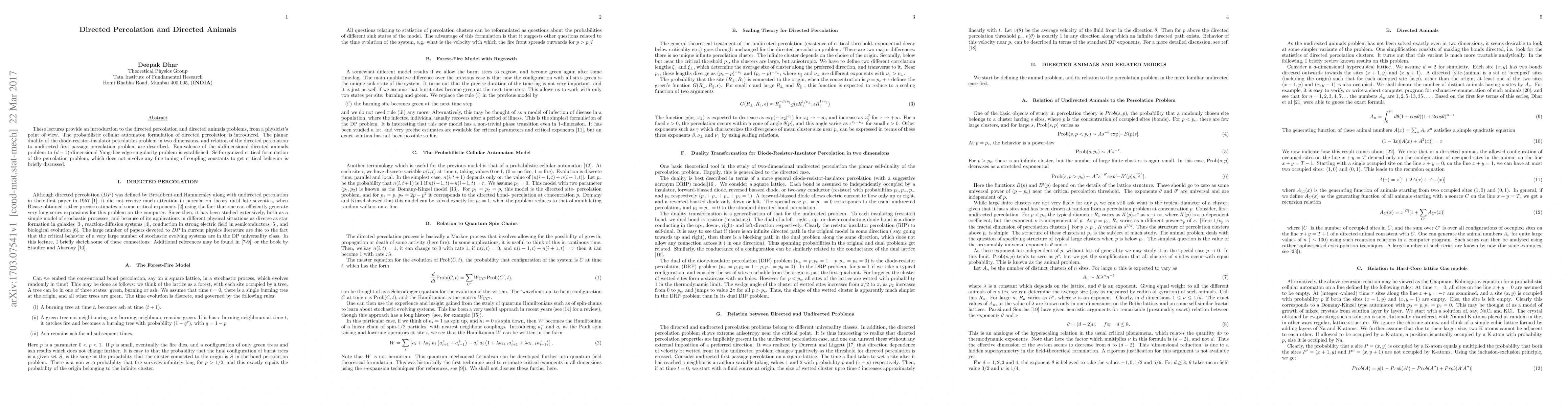 This paper introduces directed percolation and directed animals from a physicist's perspective, detailing their probabilistic cellular automaton formulations and planar duality. It also establishes equivalences between directed percolation, first passage percolation, and Yang-Lee edge-singularity problems, and briefly discusses self-organized criticality in percolation.