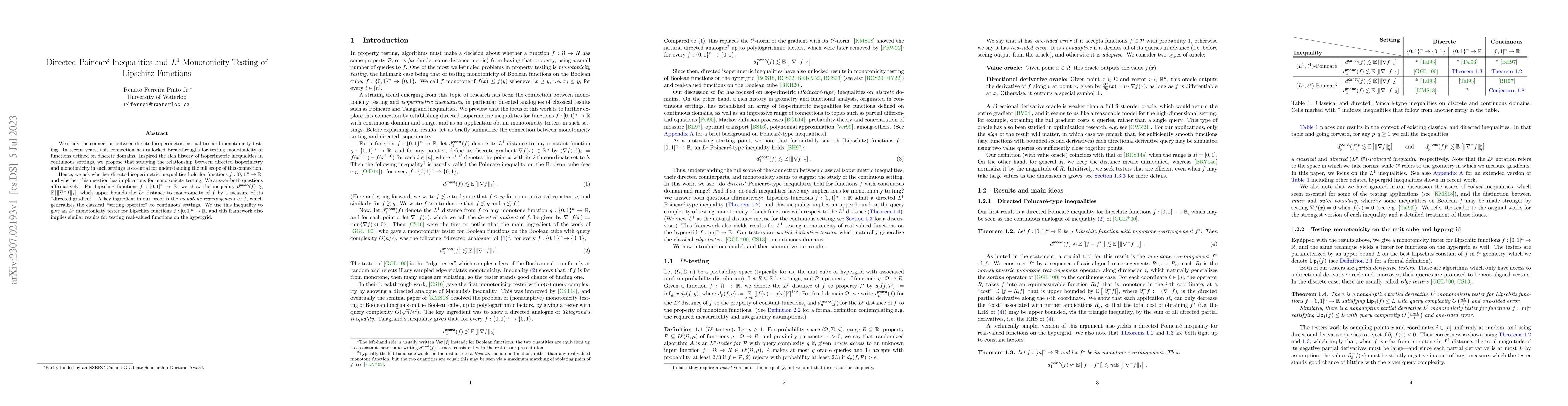 This paper establishes a directed Poincaré inequality for Lipschitz functions on $[0,1]^n$ and uses it to develop an $L^1$ monotonicity tester. The key result is that the $L^1$ distance to monotonicity is bounded by the expected "directed gradient" of the function, leveraging a continuous version of the sorting operator.