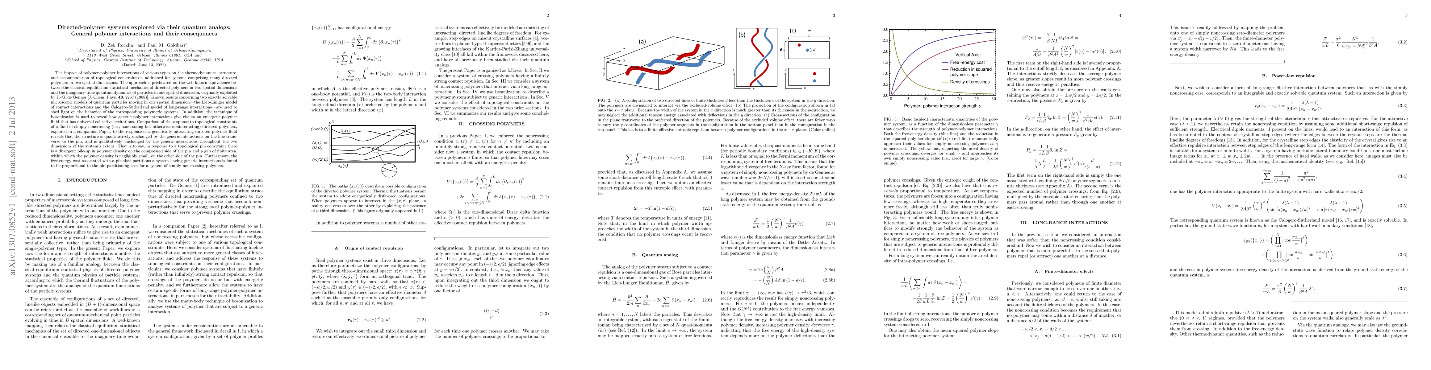 This paper explores the thermodynamic and structural effects of various polymer-polymer interactions in directed-polymer systems using quantum analogs. It reveals that despite generic interactions, the polymer fluid's response to topological constraints remains quantitatively and qualitatively similar to that of simply noncrossing polymers, with interaction-induced free-energy costs proportional to those of noninteracting systems.
