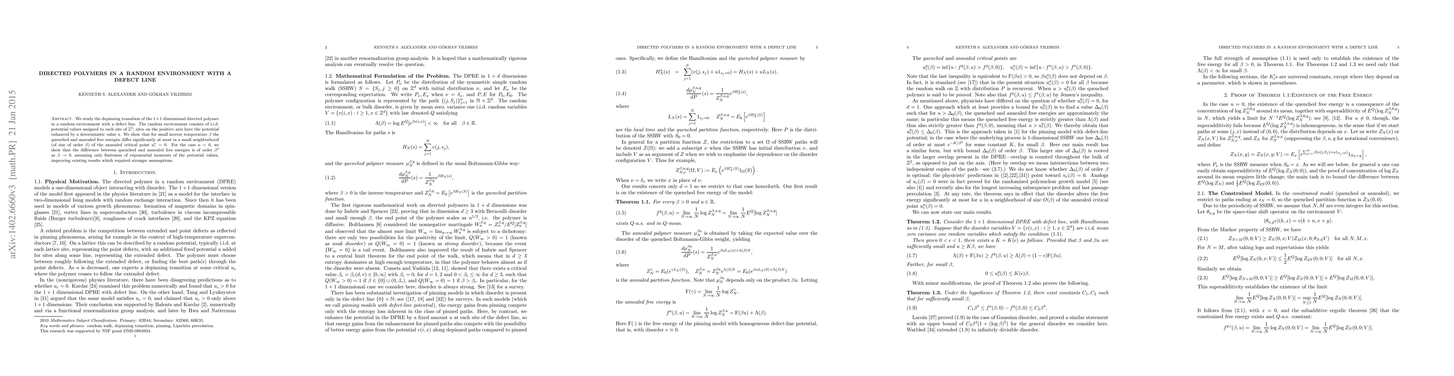 This paper investigates how a directed polymer behaves in a random environment with a defect line, finding that for small inverse temperature, the difference between quenched and annealed free energies is significant only in a small neighborhood of the critical point.