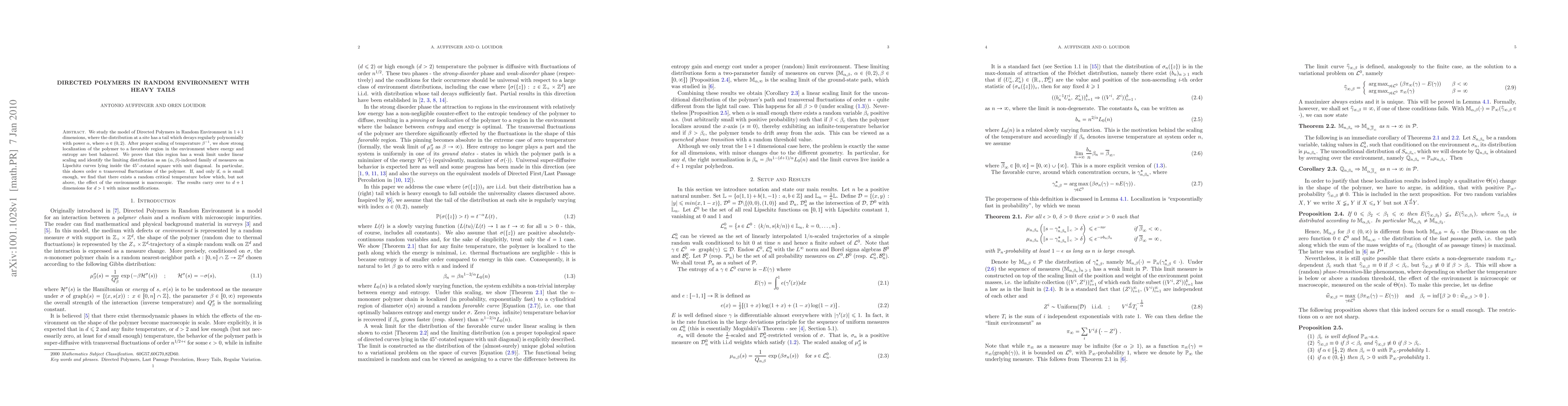 This paper investigates Directed Polymers in Random Environment with heavy-tailed distributions, demonstrating strong localization to a favorable region under proper scaling. It identifies the limiting distribution as an (\alpha, \beta)-indexed family of measures on Lipschitz curves, showing order n transversal fluctuations, and reveals a random critical temperature for macroscopic environmental effects when \alpha is sufficiently small.