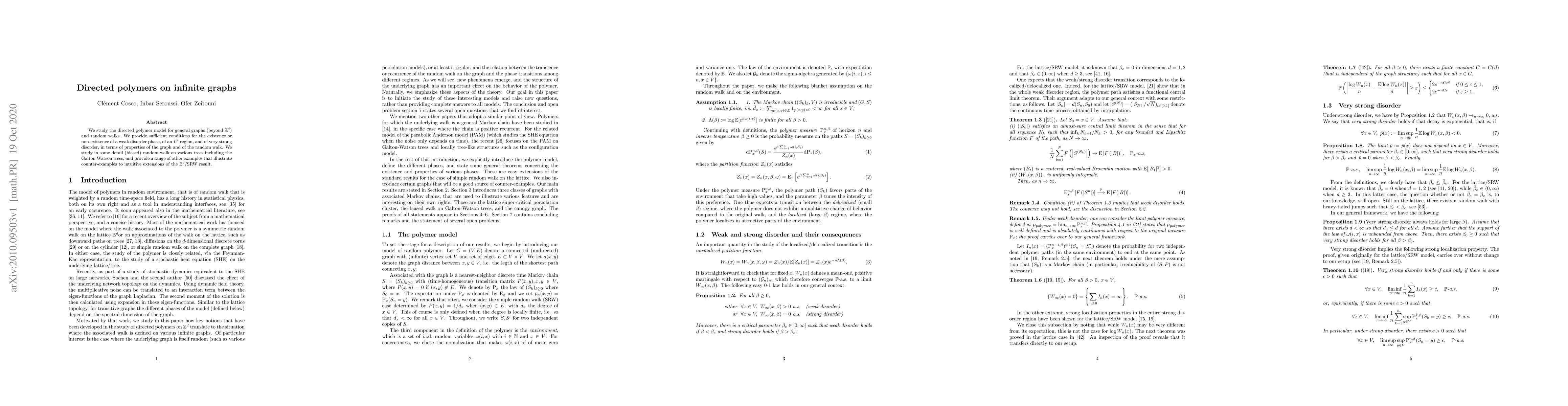 Researchers studied directed polymers on infinite graphs, finding conditions for existence of a weak disorder phase, an L2 region, and strong disorder, with implications for random walks on general graphs.