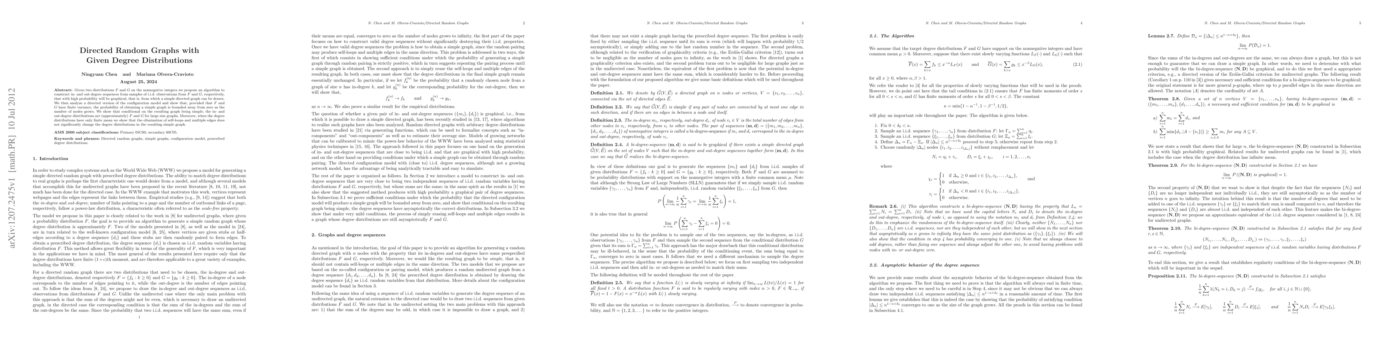 This paper proposes an algorithm to construct directed graphs with specified in- and out-degree distributions from samples, ensuring the probability of forming a simple graph is non-negligible as the graph size increases. It demonstrates that, under certain conditions, the degree distributions in the resulting simple graph closely match the input distributions.