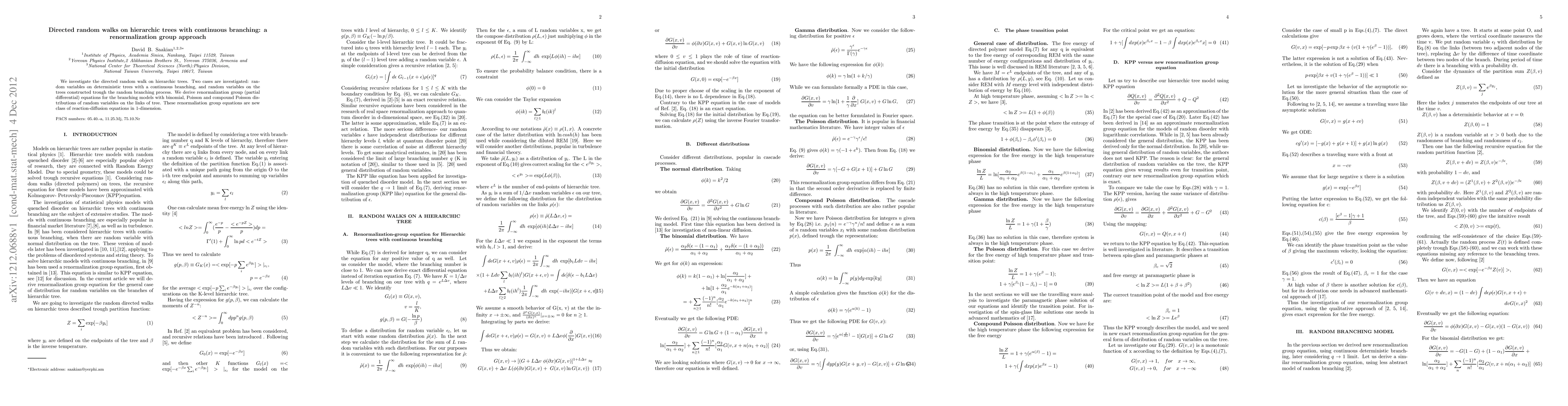 Researchers study directed random walks on hierarchic trees using a renormalization group approach, deriving new reaction-diffusion equations for branching models with different distributions of random variables.
