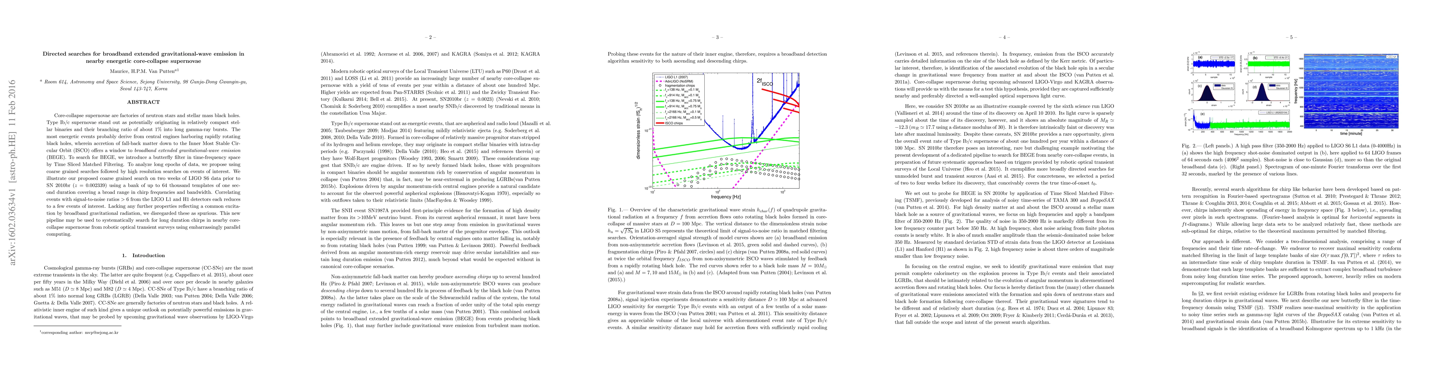 Core-collapse supernovae are factories of neutron stars and stellar mass black holes. Type Ib/c supernovae stand out as potentially originating in relatively compact stellar binaries and their branching ratio of about 1\% into long gamma-ray bursts. The most energetic events probably derive from central engines harboring rapidly rotating black holes, wherein accretion of fall-back matter down to the Inner Most Stable Circular Orbit (ISCO) offers a window to {\em broadband extended gravitational-wave emission} (BEGE). To search for BEGE, we introduce a butterfly filter in time-frequency space by Time Sliced Matched Filtering. To analyze long epochs of data, we propose using coarse grained searches followed by high resolution searches on events of interest. We illustrate our proposed coarse grained search on two weeks of LIGO S6 data prior to SN 2010br $(z=0.002339)$ using a bank of up to 64 thousand templates of one second duration covering a broad range in chirp frequencies and bandwidth. Correlating events with signal-to-noise ratios $>6$ from the LIGO L1 and H1 detectors each reduces to a few events of interest. Lacking any further properties reflecting a common excitation by broadband gravitational radiation, we disregarded these as spurious. This new pipeline may be used to systematically search for long duration chirps in nearby core-collapse supernovae from robotic optical transient surveys using embarrassingly parallel computing.