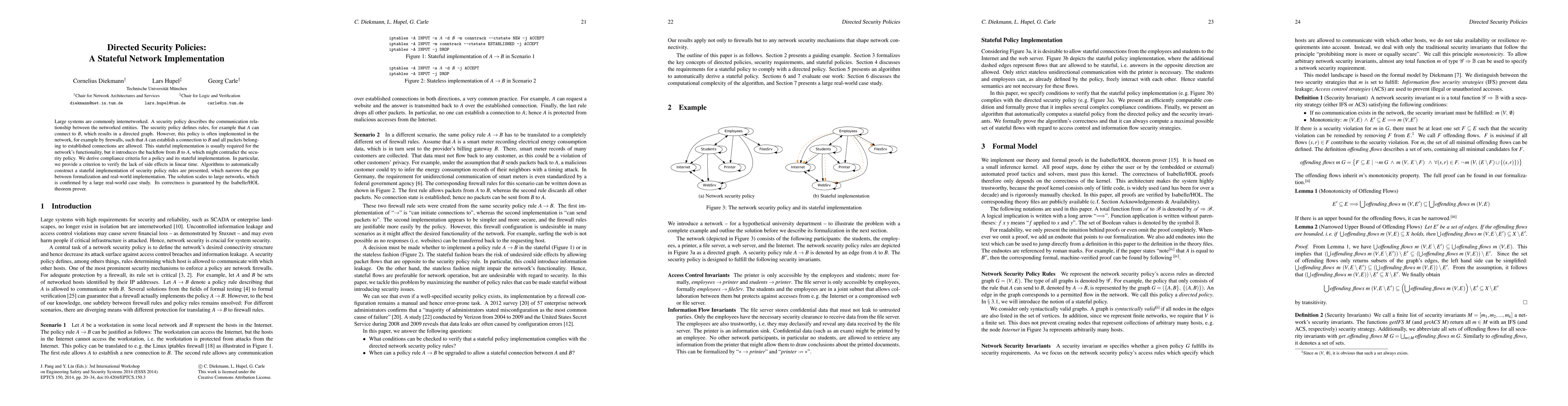 The paper presents a stateful network implementation of security policies, deriving compliance criteria and providing algorithms for automated construction. It ensures correctness via the Isabelle/HOL theorem prover and validates the solution through a large real-world case study.