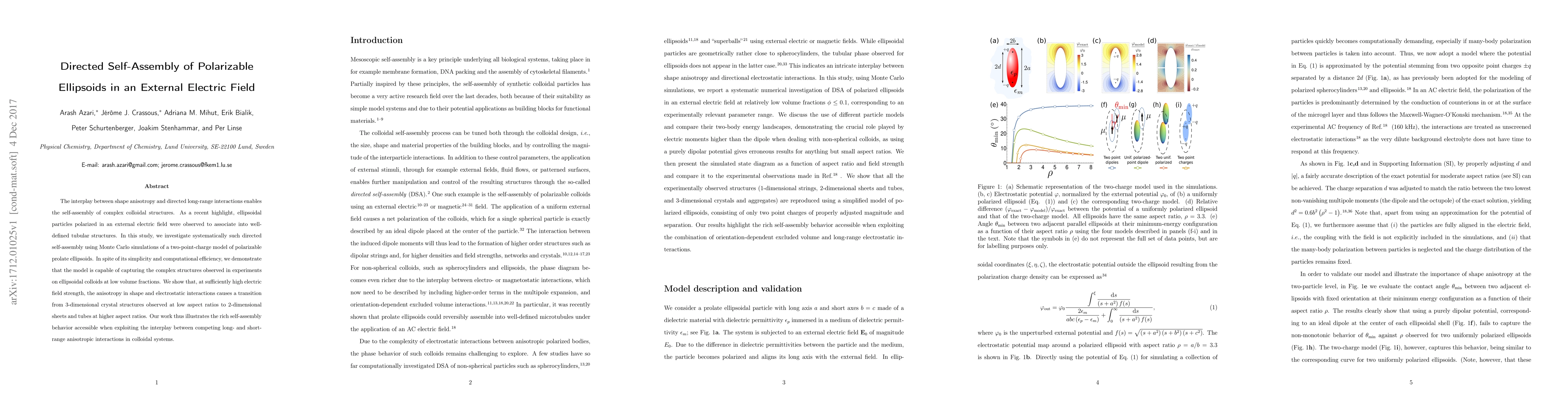This study uses Monte Carlo simulations to explore the directed self-assembly of polarizable ellipsoids in an external electric field, revealing the transition from 3D crystals to 2D sheets and tubes as field strength and aspect ratio increase. The findings highlight the complex structures formed through the interplay of shape anisotropy and electrostatic interactions.