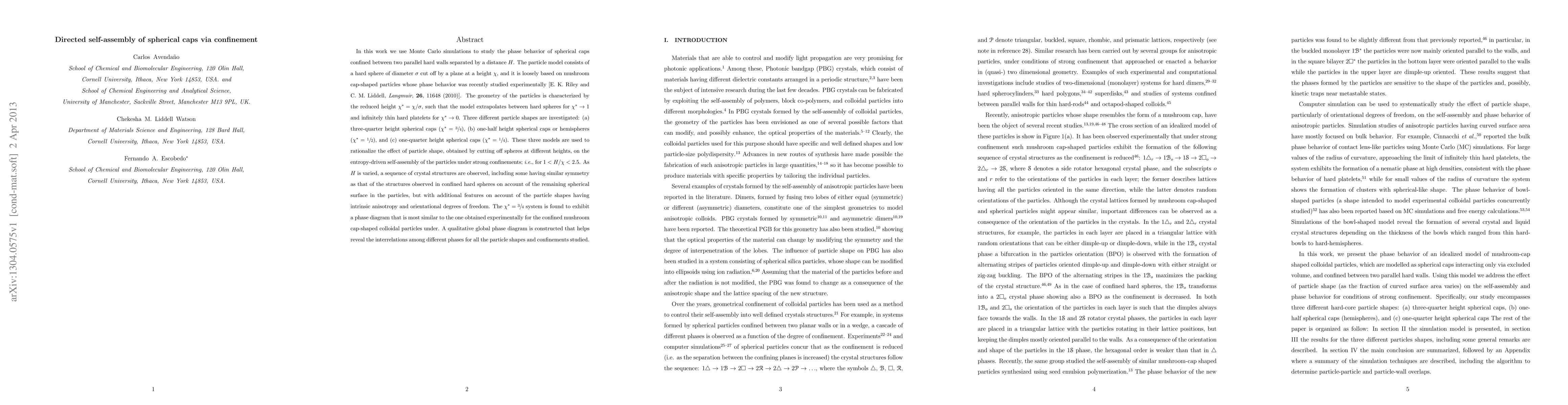 This paper uses Monte Carlo simulations to investigate the phase behavior of spherical caps confined between parallel walls, focusing on how varying the height of the caps influences their self-assembly. The study reveals a sequence of crystal structures, with the three-quarter height caps showing phase behavior most similar to experimental results for confined mushroom cap-shaped particles.